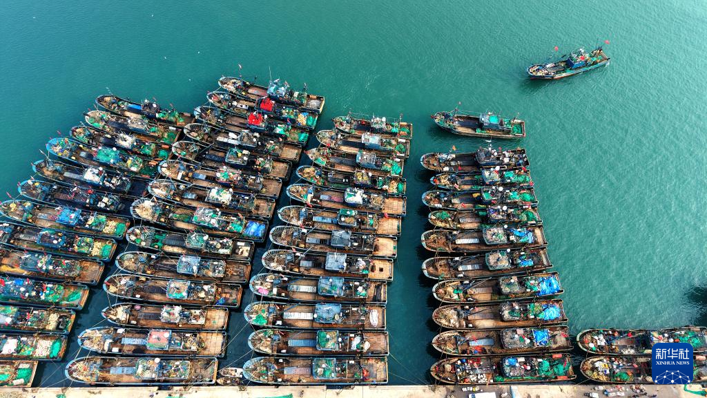 12月11日,在山东青岛西海岸新区积米崖渔港,渔船停靠在泊位上(无人机照片)。新华社发(俞方平 摄)