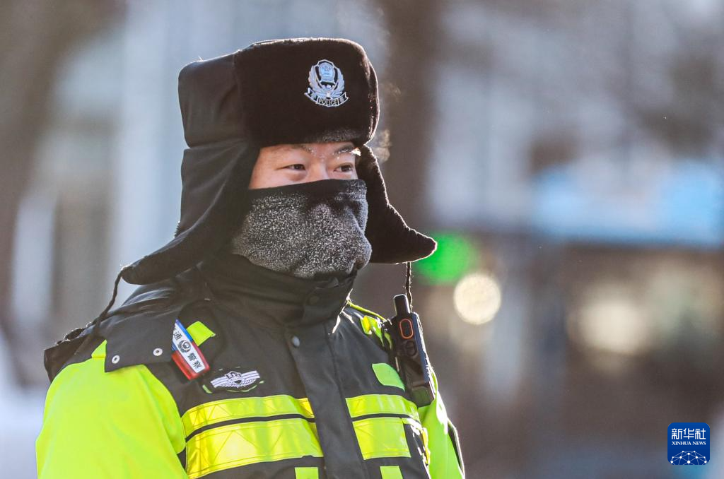 12月11日,在黑龙江省伊春市伊美区,一名交警在寒潮中指挥交通。新华社发(李佳星摄)