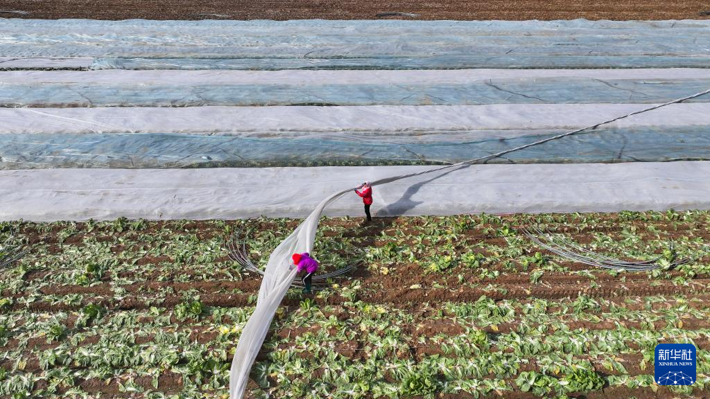 12月11日,在山东省东营市广饶县李鹊镇,农民为作物覆盖防寒无纺布(无人机照片)。新华社发(刘云杰摄)