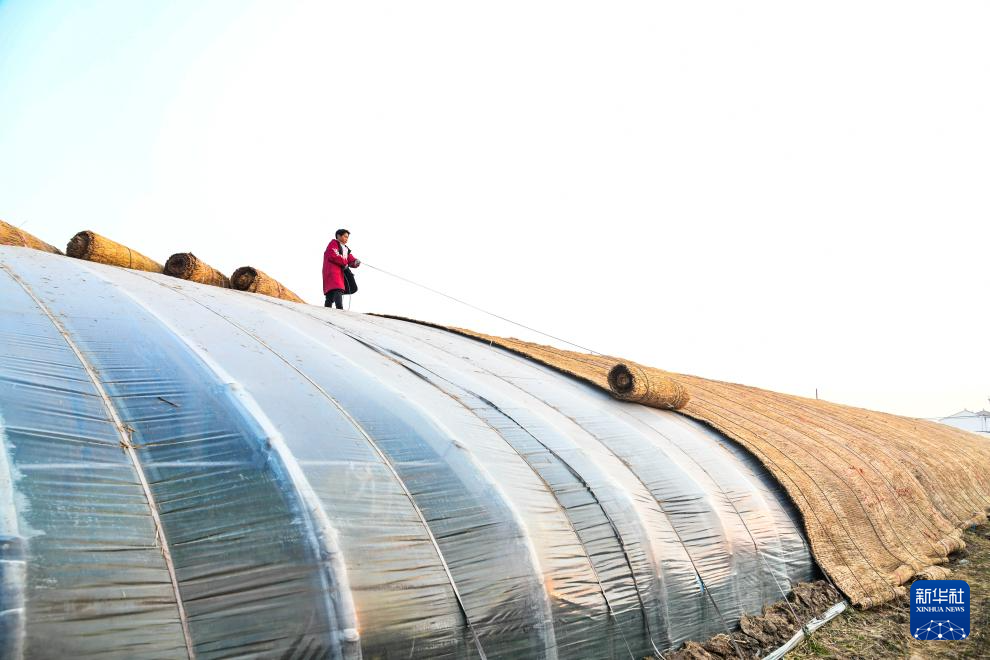 12月11日,河南省济源市思礼镇农民为蔬菜大棚加盖保温草帘。新华社发(苗秋闹摄)