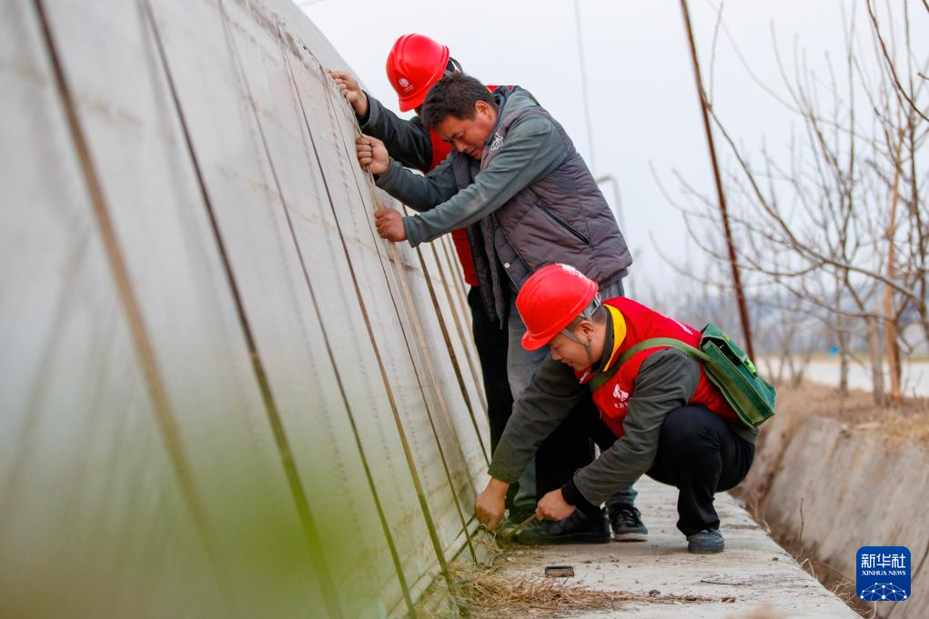 12月10日,在河南省商丘市睢县周堂镇齐庄村有机蔬菜种植基地内,国网河南省电力公司睢县供电公司“电力雷锋”志愿服务队志愿者帮助菜农加固蔬菜大棚。新华社发(徐泽源摄)