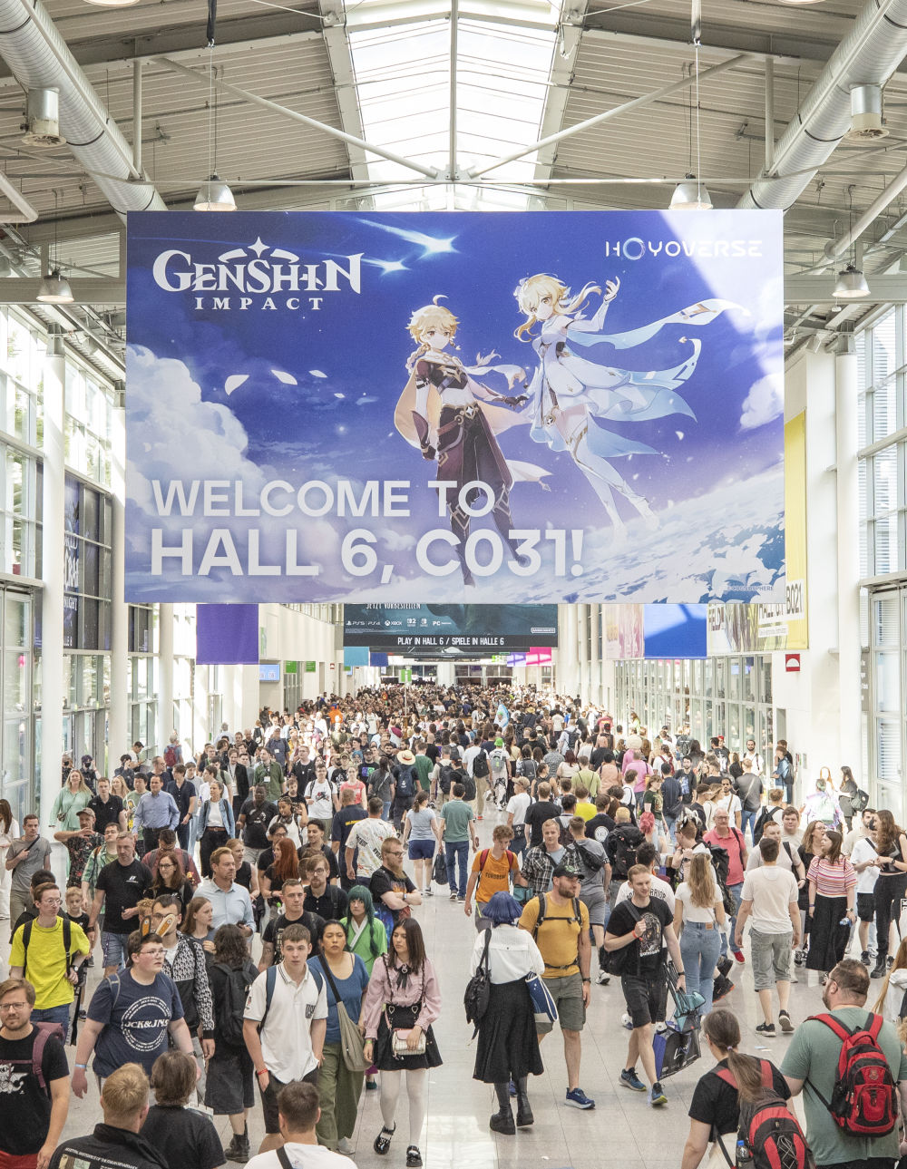 ↑2025年8月21日,在德国科隆,参观者在科隆游戏展走过游戏《原神》海报。在2025年科隆国际游戏展上,中国游戏企业参展规模和热度较去年进一步提升。展馆内多处可见中国展台,多款新作试玩区前排起长龙。中国游戏正以更自信的姿态走向欧洲市场。