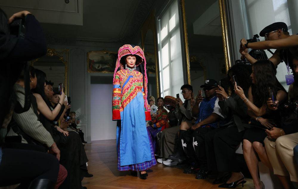 ↑2025年10月1日,在法国巴黎中国文化中心举行的第三届中法时装周上,模特在“非遗四川·百城百艺”盐边·傈僳族服饰时尚秀上展示服装。第三届中法时装周依托巴黎中国文化中心搭建的时尚秀场,为中法设计师与品牌提供了展示平台。
