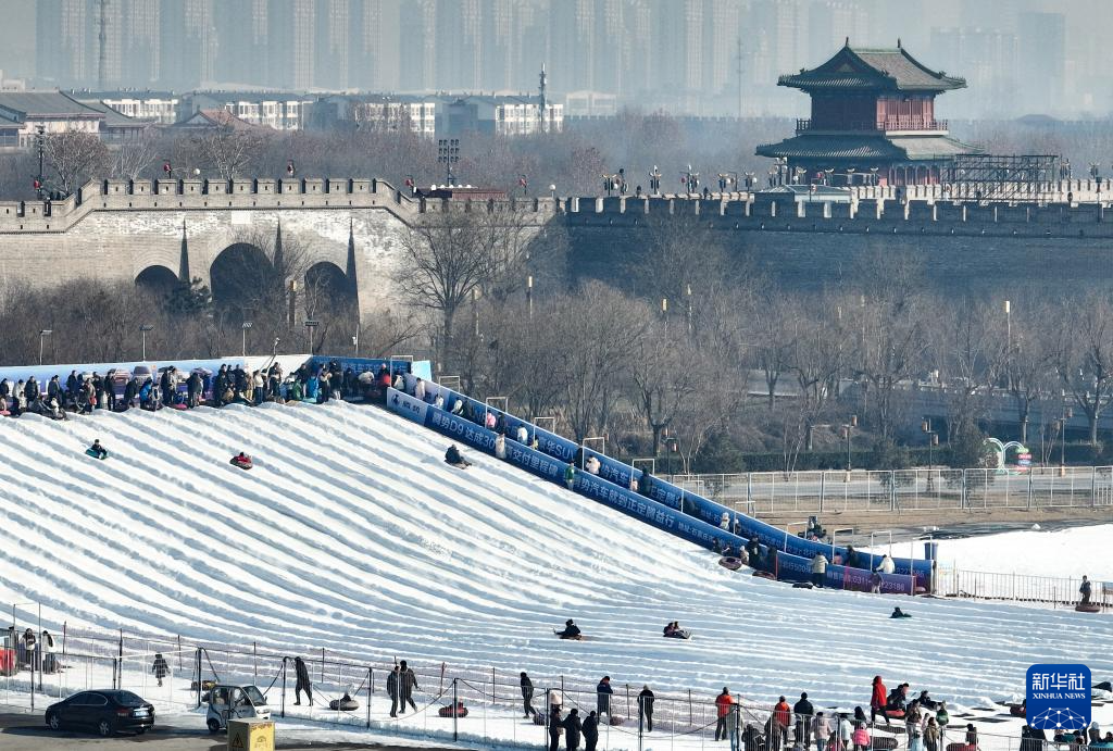 12月28日,游客在河北省石家庄市正定县长乐门广场冰雪嘉年华游玩(无人机照片)。新华社发(张晓峰 摄)