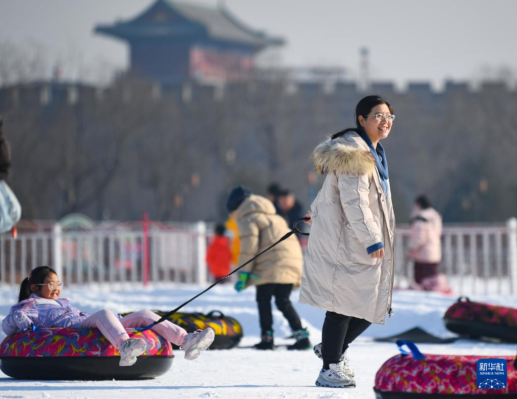 12月28日,小朋友和家长在河北省石家庄市正定县长乐门广场冰雪嘉年华游玩。新华社发(张晓峰 摄)