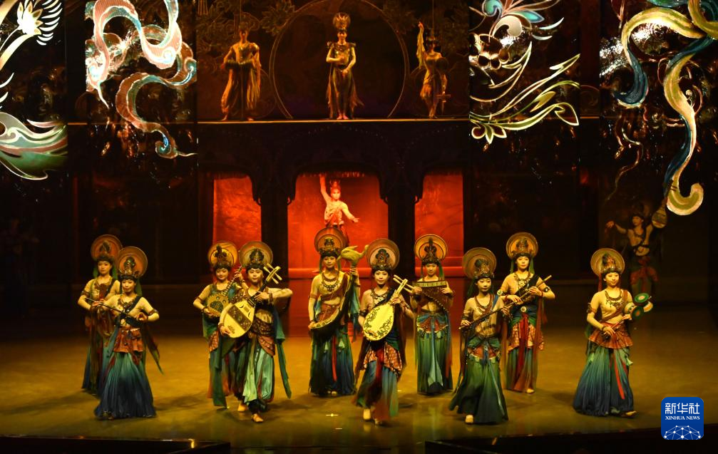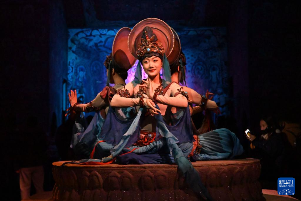1月9日晚,乐动敦煌(敦煌)文化旅游产业发展有限公司的演员在大型洞窟沉浸式体验剧《乐动敦煌》中表演。新华社发(张晓亮 摄)