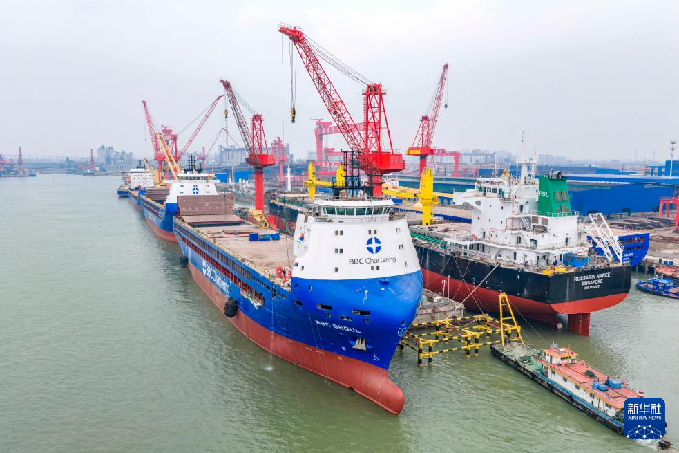 2026年2月2日,在江苏省泰州市高港区的泰州三福船舶工程有限公司生产基地,多艘大型船舶在建造中(无人机照片)。新华社发(周社根摄)
