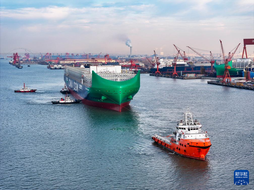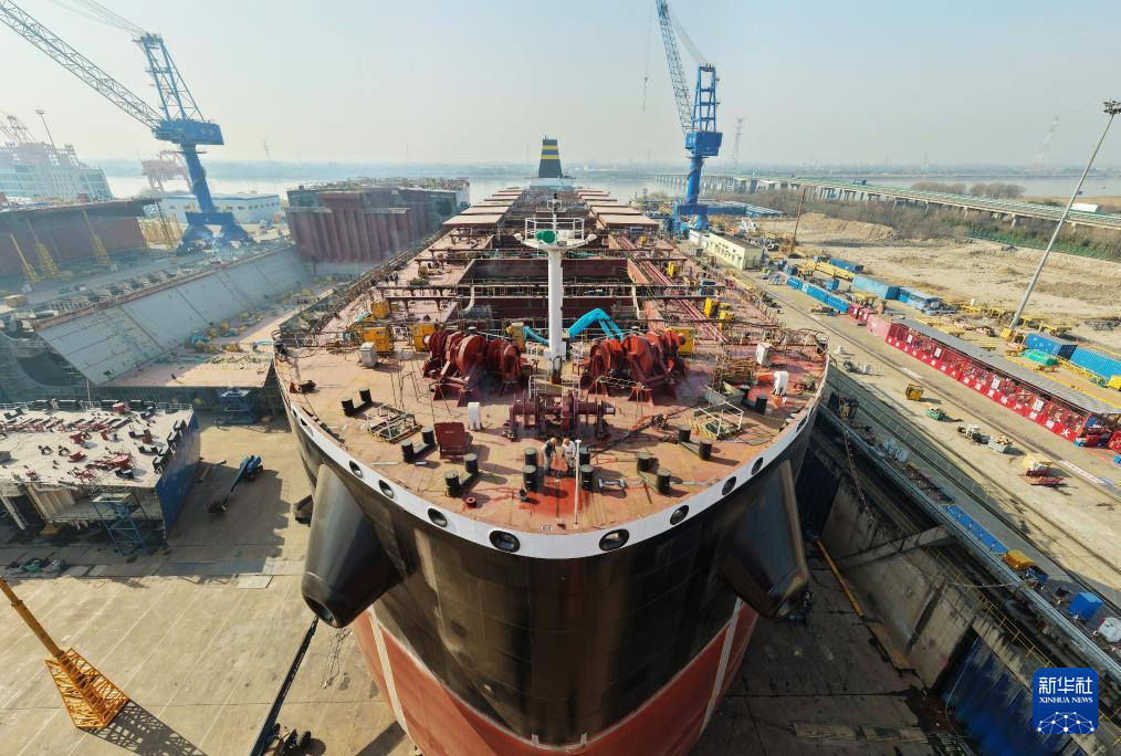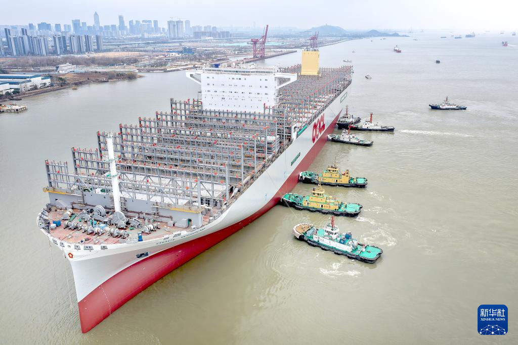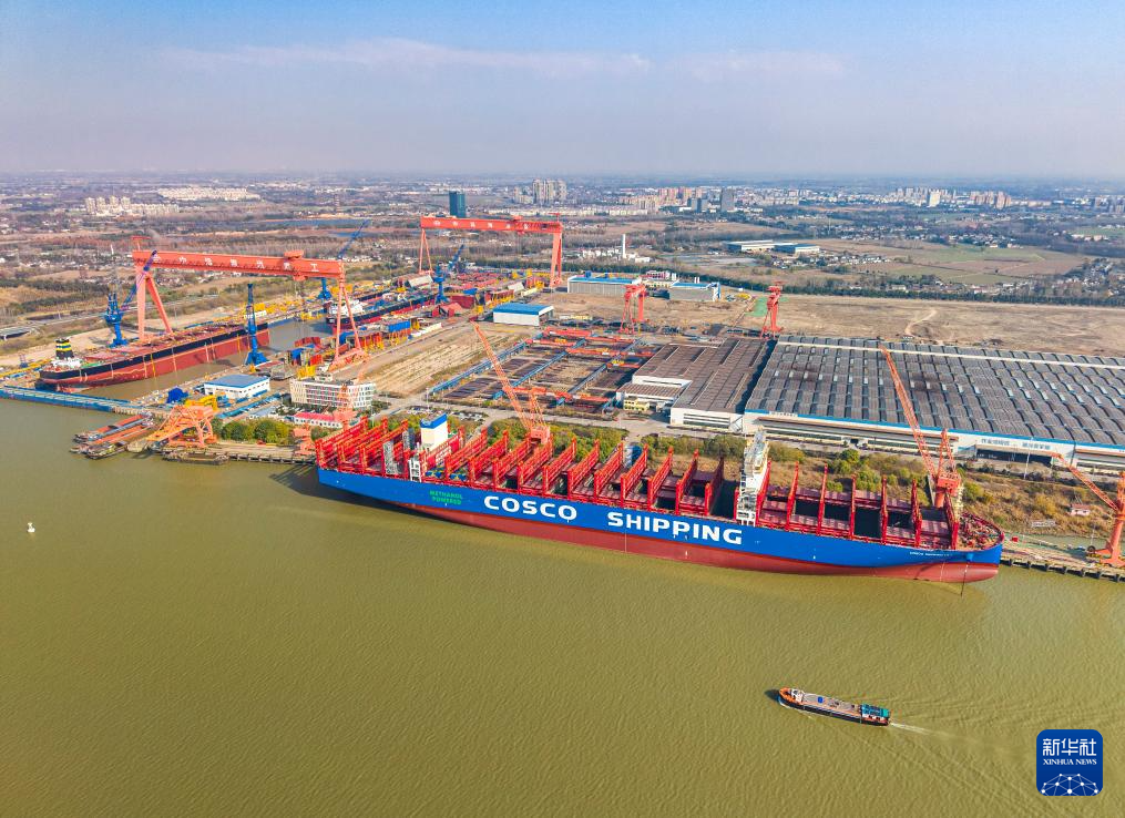 2025年12月31日,由南通中远海运川崎建造的超大型24000标箱甲醇双燃料集装箱船首制船在南通市崇川区船舶海工产业带顺利出坞(无人机照片)。新华社发(许丛军摄)