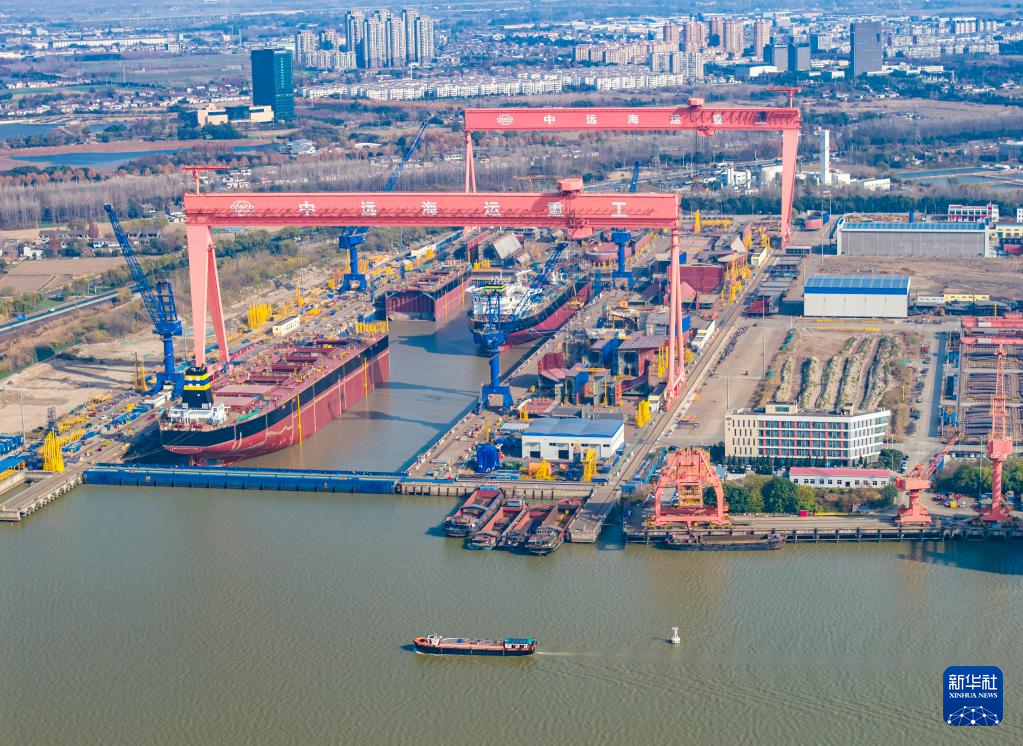2025年12月10日,在江苏省扬州市江都区扬州中远海运重工有限公司,工人在生产厂区生产大型船舶(无人机照片)。新华社发(任飞摄)