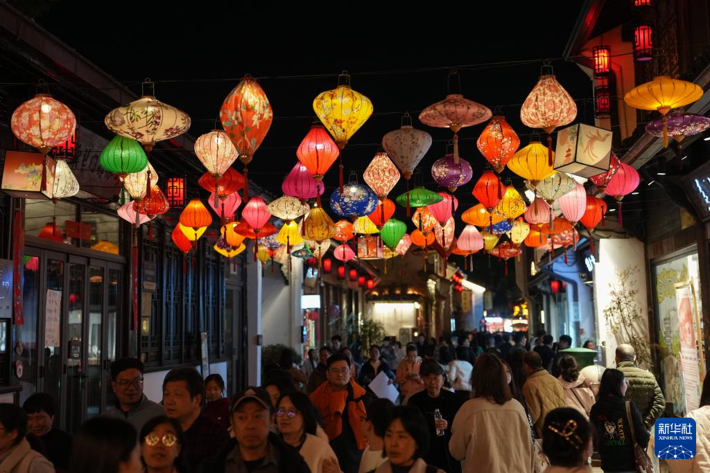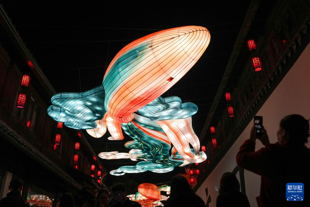 春节假期,浙江省杭州市拱墅区桥西历史文化街区的传统灯笼与“大鱼海棠”主题灯组在夜色中交相辉映,成为市民和游客打卡的热门目的地。