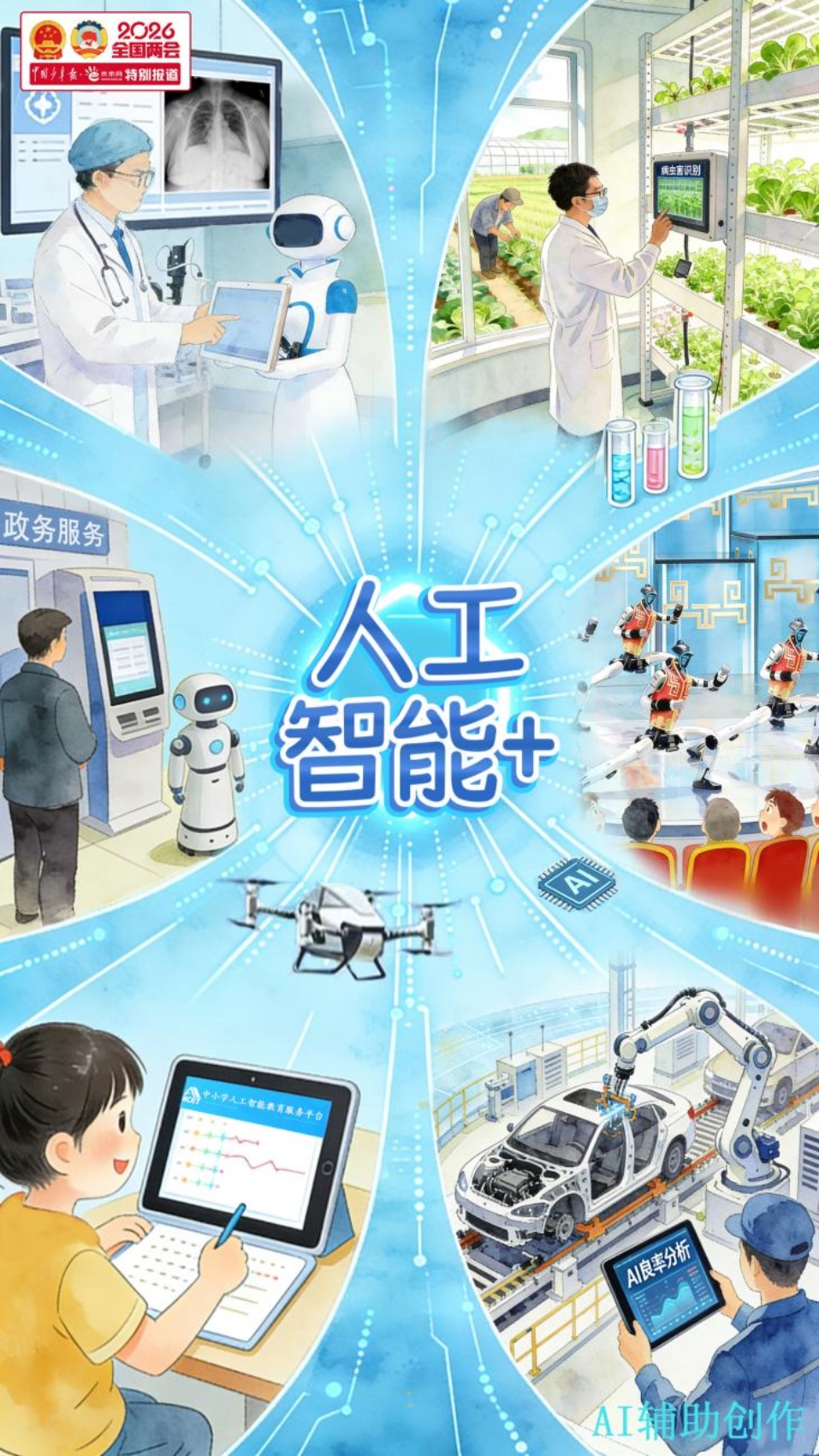 AI不止陪伴青少年成长,更融入社会肌理。政府工作报告已连续3年部署“人工智能+”,今年首次提出“打造智能经济新形态”,就是要抓住人工智能发展的机遇,拓展人工智能赋能千行百业的广度和深度,尽快打开经济增长的新空间,培育新模式、壮大新动能。“十五五”规划纲要(草案)也明确“全面实施‘人工智能+’行动”“抢占人工智能产业应用制高点”。国家发展改革委主任郑栅洁透露,“十五五”末我国人工智能相关产业规模将增长到10万亿元以上。从技术突破到产业落地,AI正加速走进车间、写字楼和千家万户。