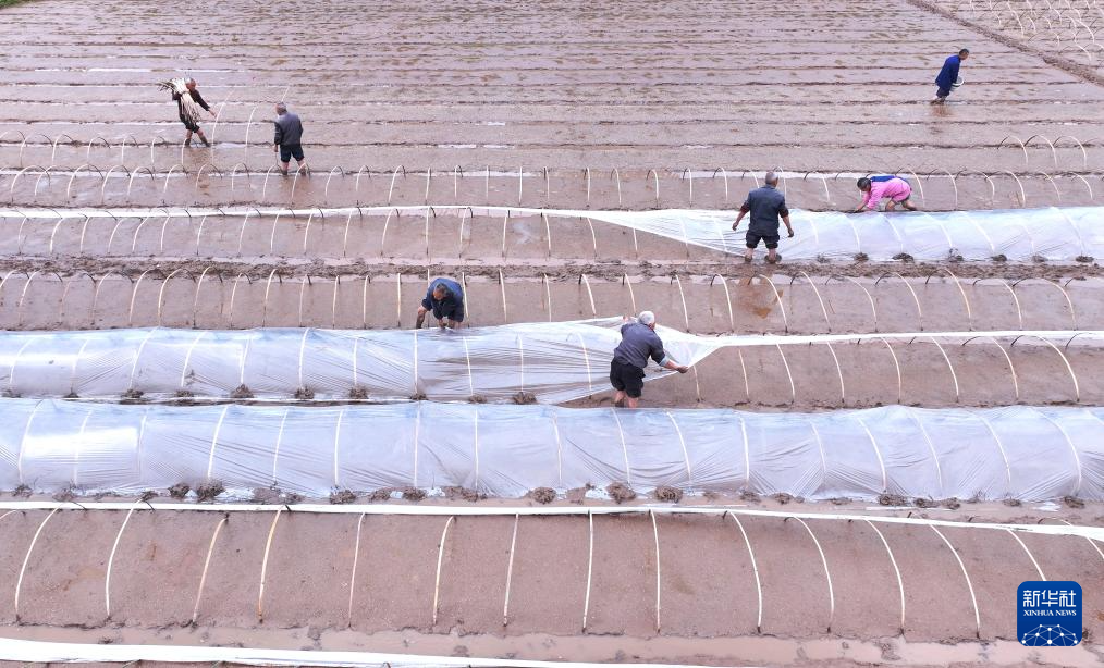 3月30日,湖南省衡阳市祁东县归阳镇村民在大棚育秧基地进行早稻育秧管护工作。新华社发(曹正平摄)