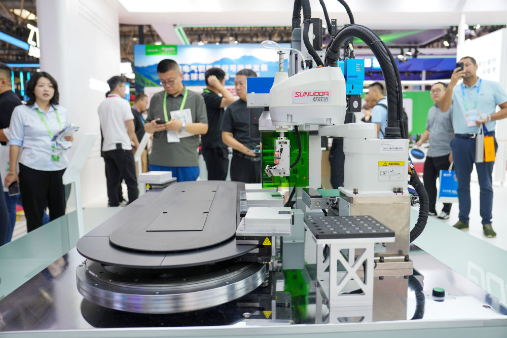 2025年7月17日,在北京举行的第三届中国国际供应链促进博览会上,参观者在欣旺达展台参观磁悬浮输送产线展示。新华社记者 鞠焕宗 摄