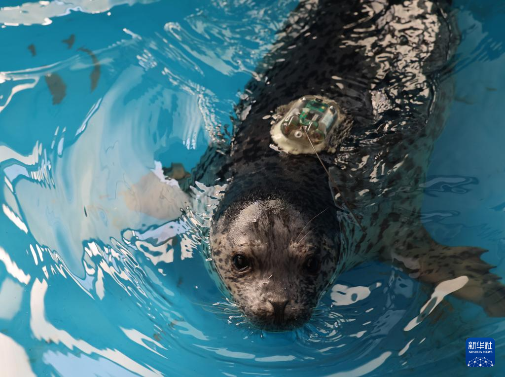 4月15日,辽宁省农业科学院所属辽宁省海洋水产科学研究院的一处水池中,一头待放归的斑海豹在水中游动,它的背部粘贴着用于监测和追踪的信标。新华社记者 韩赫 摄