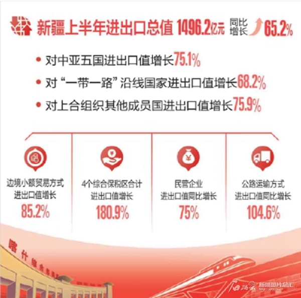 7月21日,新疆外贸2023年上半年成绩单出炉——据乌鲁木齐海关统计,上半年,新疆外贸进出口总值达1496.2亿元人民币,同比增长65.2%,进出口增速高出全国增速63.1个百分点。这是新疆外贸总值在历史同期首次突破千亿元,创十年来同期新高。
