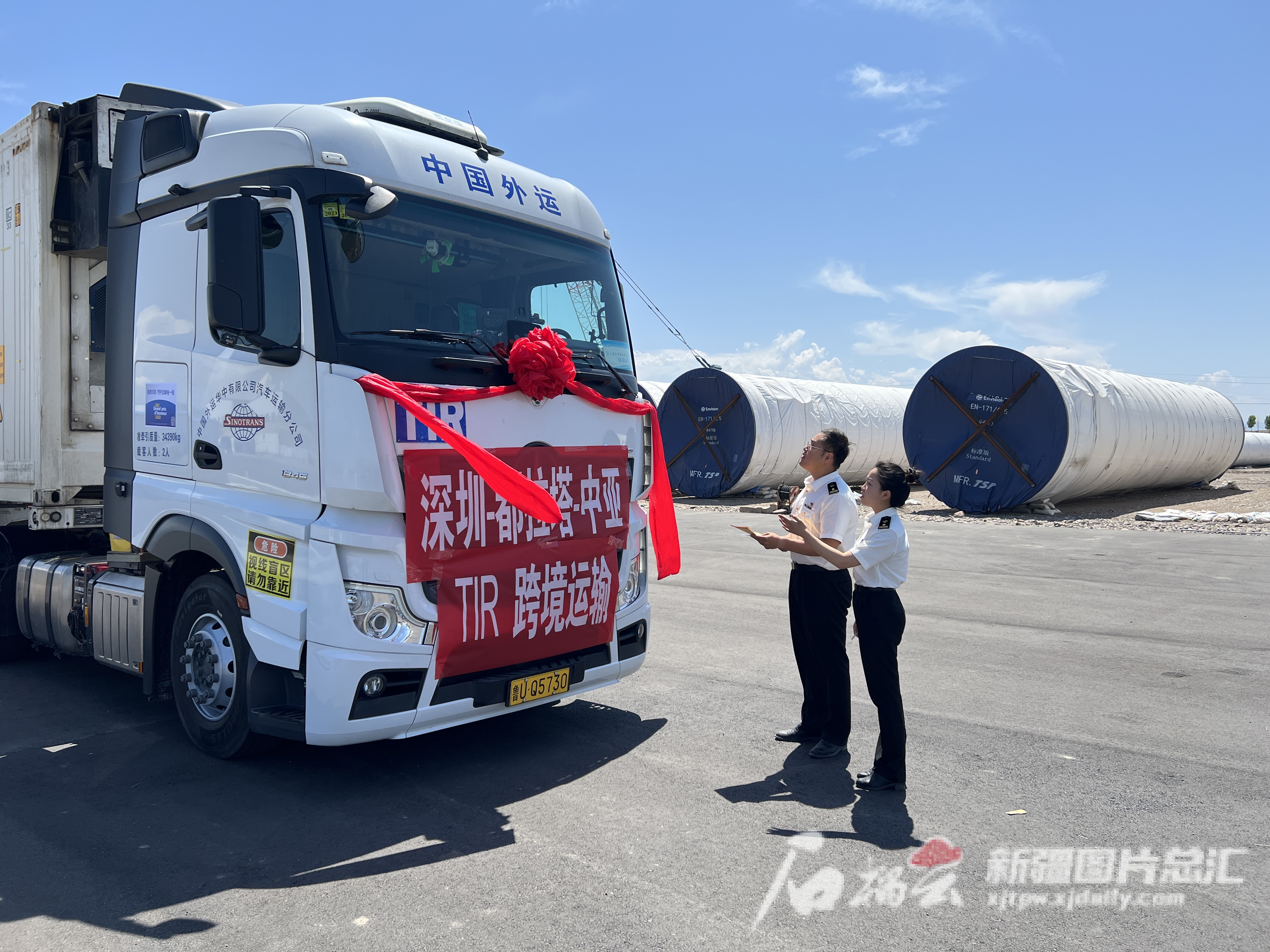 7月4日,装载智能家用电器的国际公路运输公约(TIR)运输车辆经都拉塔口岸出境,前往目的地哈萨克斯坦阿拉木图市。图为都拉塔海关关员现场核对TIR车辆信息。吴梦飞 摄