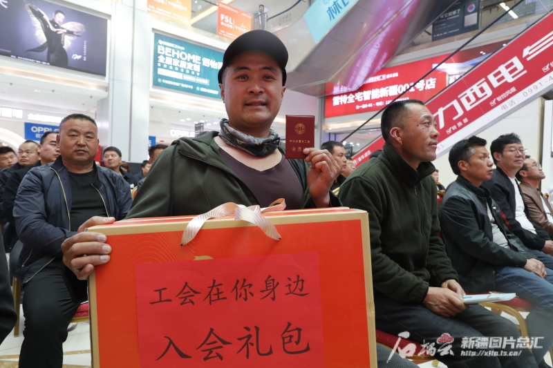 4月16日,来自昌吉市的货车司机马国乐在入会活动中展示自己的中华全国总工会会员证及入会大礼包。石榴云/新疆日报记者 秦鹏摄