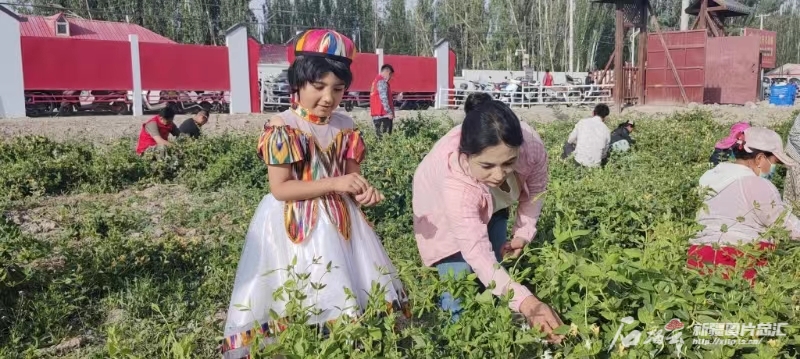 2023年6月,阿克陶县皮拉勒乡依克其来村村民在采摘金银花。卞海生供图