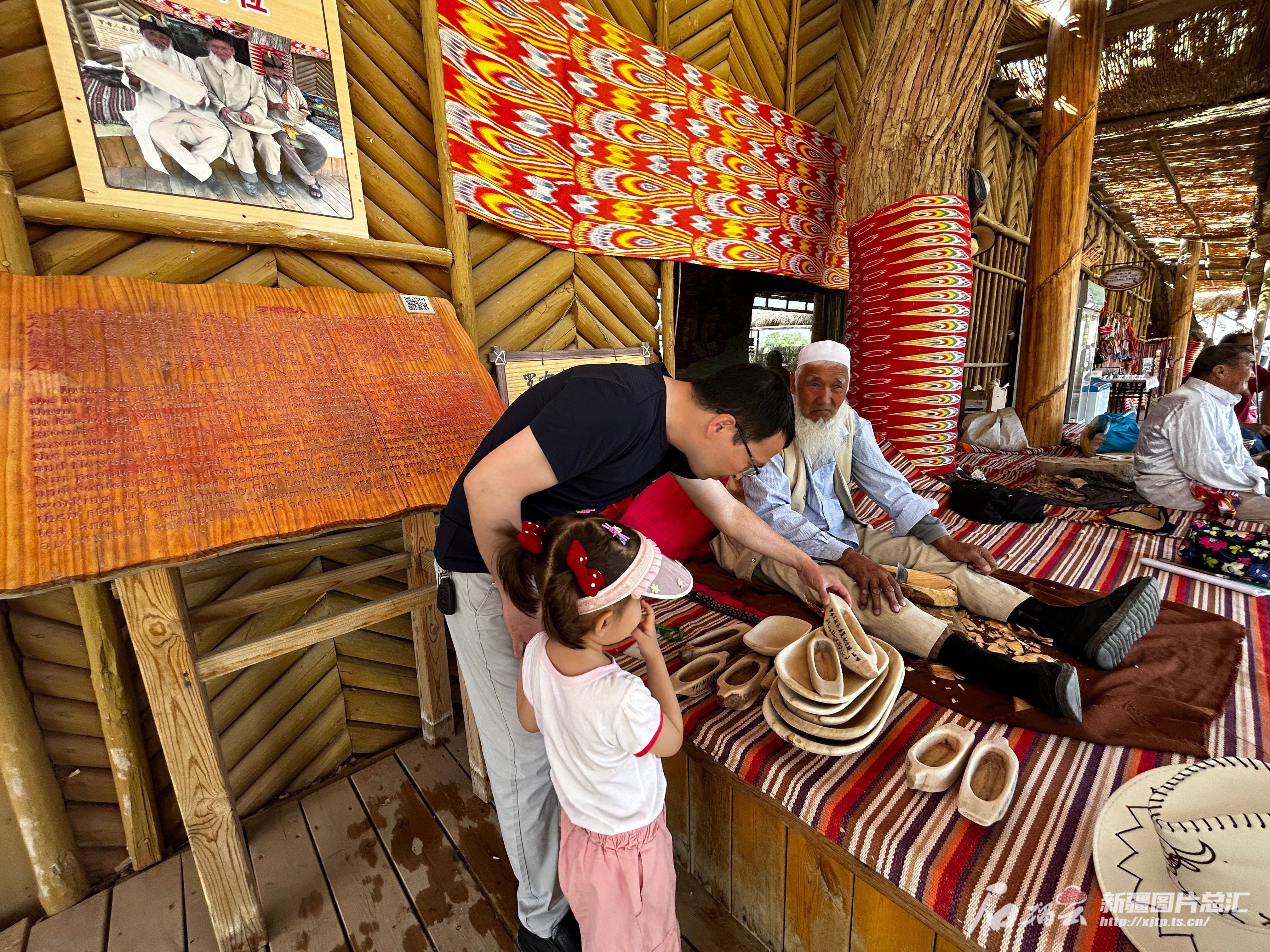 5月3日,来自阿克苏的小游客爱丽丝·依斯热比力在观看卡盆制作。 石榴云/新疆日报记者 张小宓摄