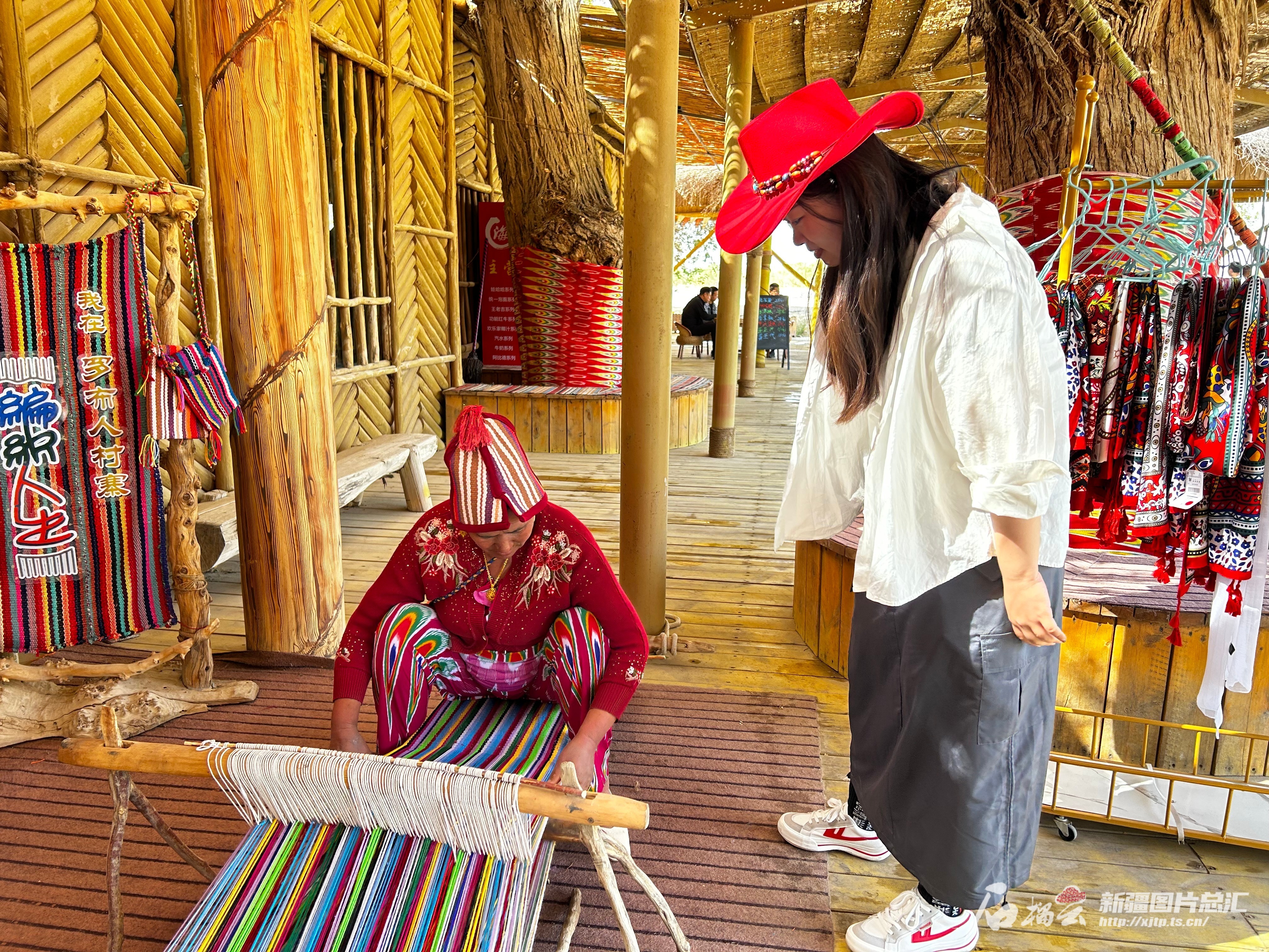 5月3日一大早,65岁的乔丽盼汗·艾买提就来到帕拉孜坊前,为游客展示传统纺织技艺,她用手拿着线灵活地穿梭,织出一寸寸美丽布料。来自乌鲁木齐市的游客赵靖竖起大拇指,不时还有游客动手体验。