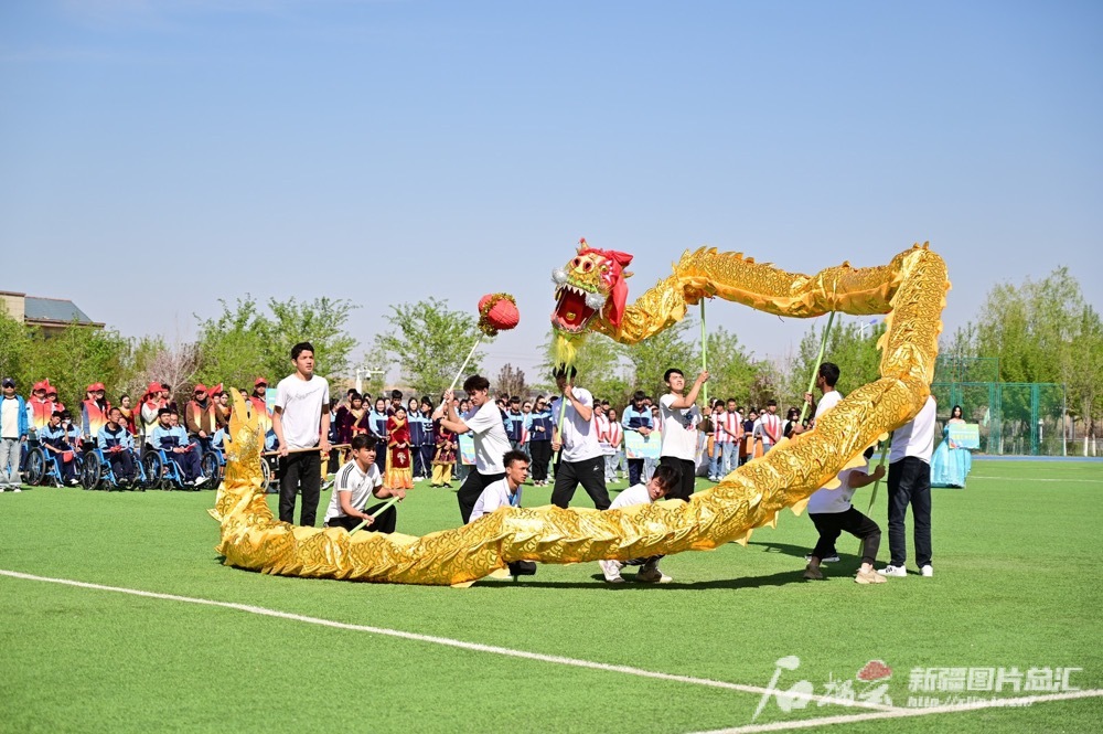 4月29日,新疆残疾人职业中专学校第二十二届学生运动会开幕现场,听力障碍学生进行舞龙表演。新疆残疾人职业中专学校供图