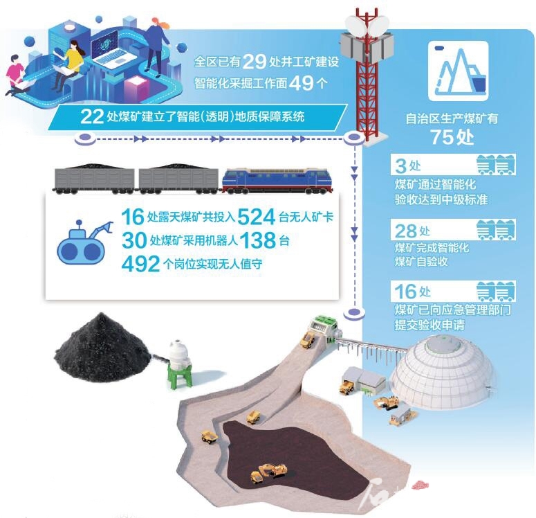 截至目前,自治区生产煤矿有75处,已有3处煤矿通过智能化验收达到中级标准,28处煤矿完成智能化煤矿自验收,16处煤矿已向应急管理部门提交验收申请。目前,全区已有29处井工矿建设智能化采掘工作面49个;22处煤矿建立了智能(透明)地质保障系统;16处露天煤矿共投入524台无人矿卡;30处煤矿采用机器人138台;492个岗位实现无人值守。
