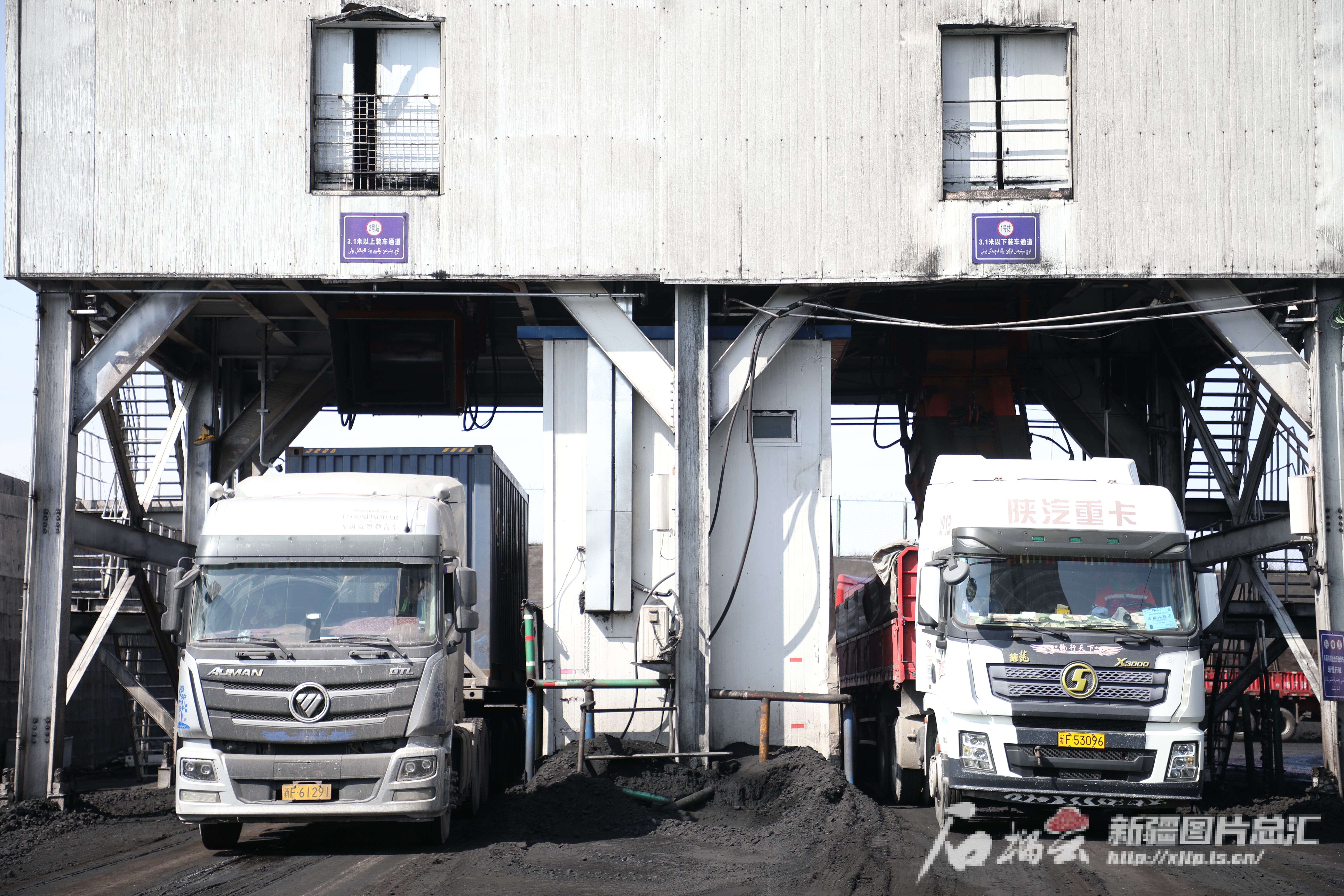 5月25日,在山东能源集团新疆能化公司伊犁一矿,运煤车辆在快速装车站下装车。马畅 摄。