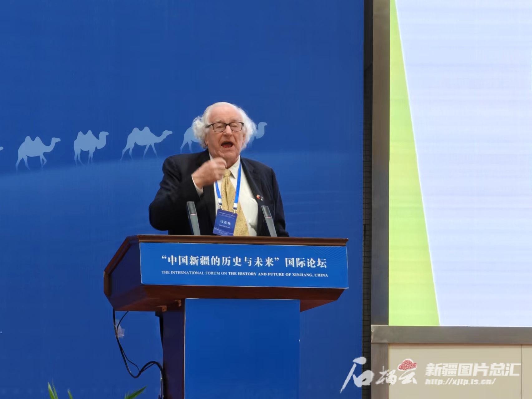 6月12日,在“中国新疆的历史与未来”国际论坛上,澳大利亚格里菲斯大学荣誉教授、澳大利亚联邦人文学院院士马克林作主旨演讲。石榴云/新疆日报 记者 范琼燕摄