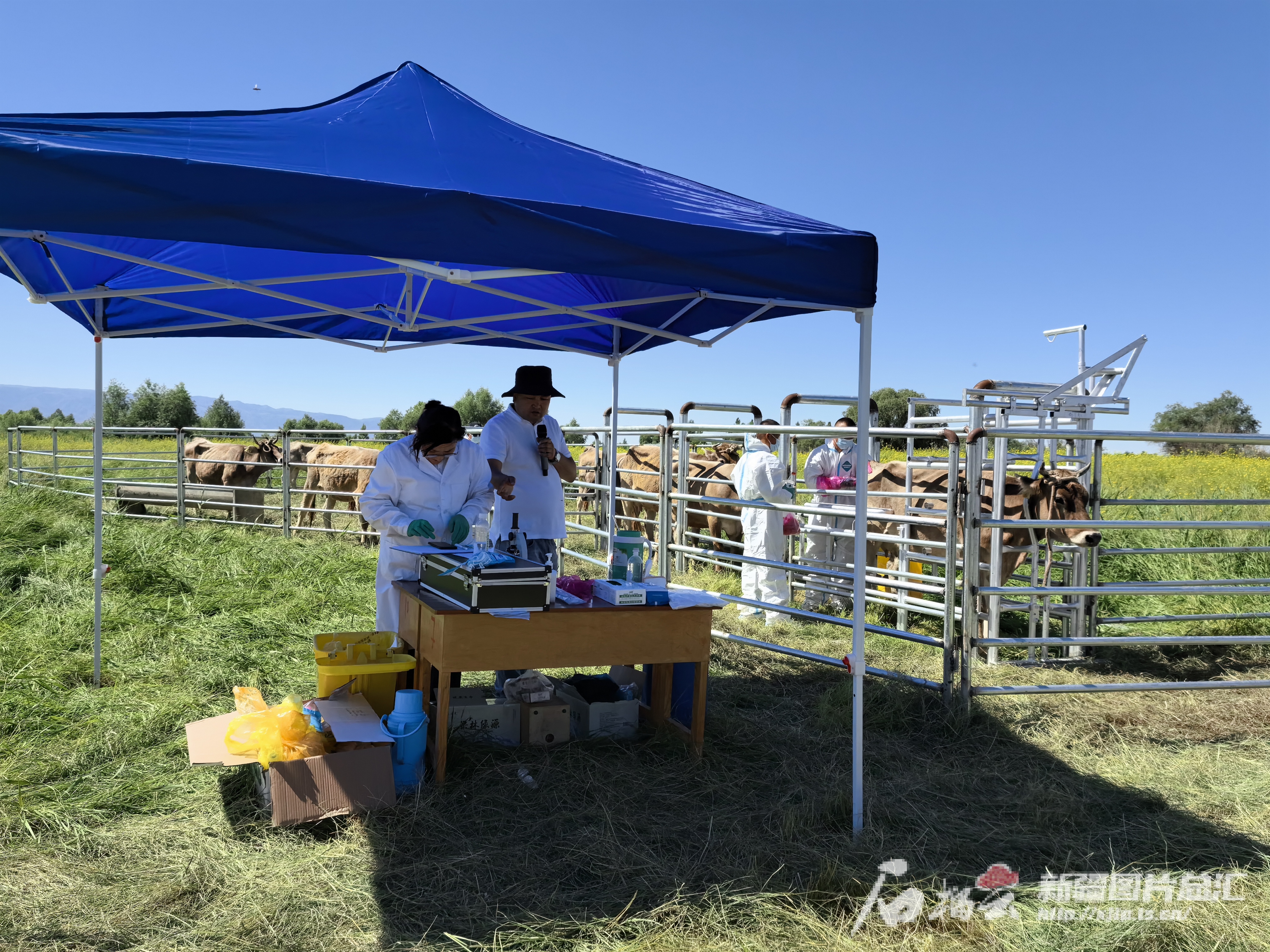 6月21日,在塔城地区额敏县萨尔也木勒春秋牧场,工作人员正在开展褐牛冷配技术推广工作。天山网-新疆日报记者 马帛宇摄