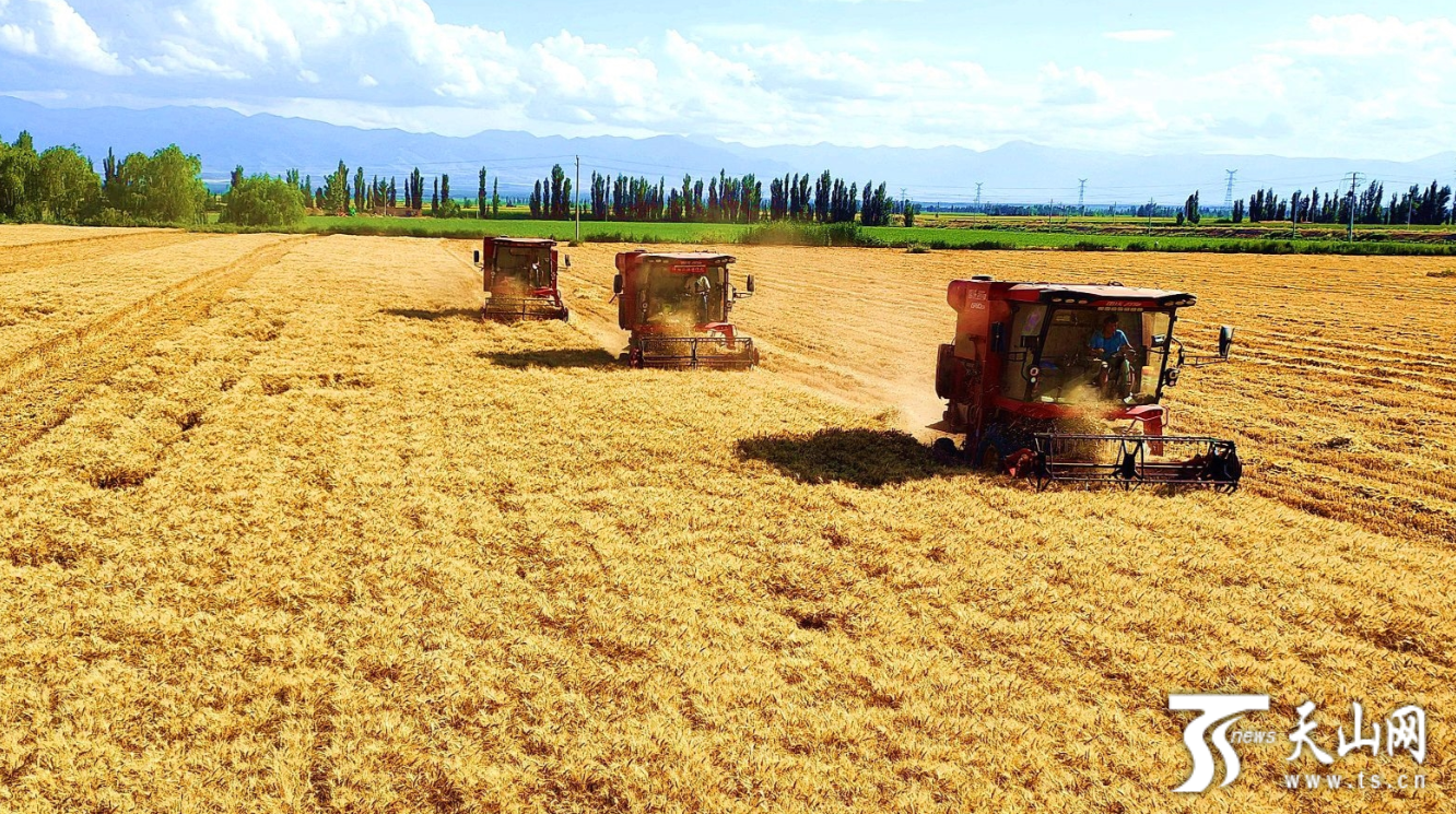 7月6日,在察布查尔锡伯自治县孙扎齐牛录镇阿帕尔村小麦种植基地,联合收割机穿梭麦浪间忙收获。今年,该县共种植小麦34.66万亩,6月底进入收获期,眼下,各乡镇小麦种植户正抢抓农时,加紧收割,确保颗粒归仓。华岩明摄