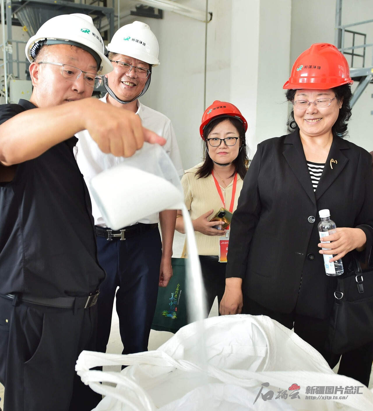 8月21日,参加投产仪式暨污水处理一体化零排研讨会的代表在参观从污水中提取的国标化工业用盐产品。