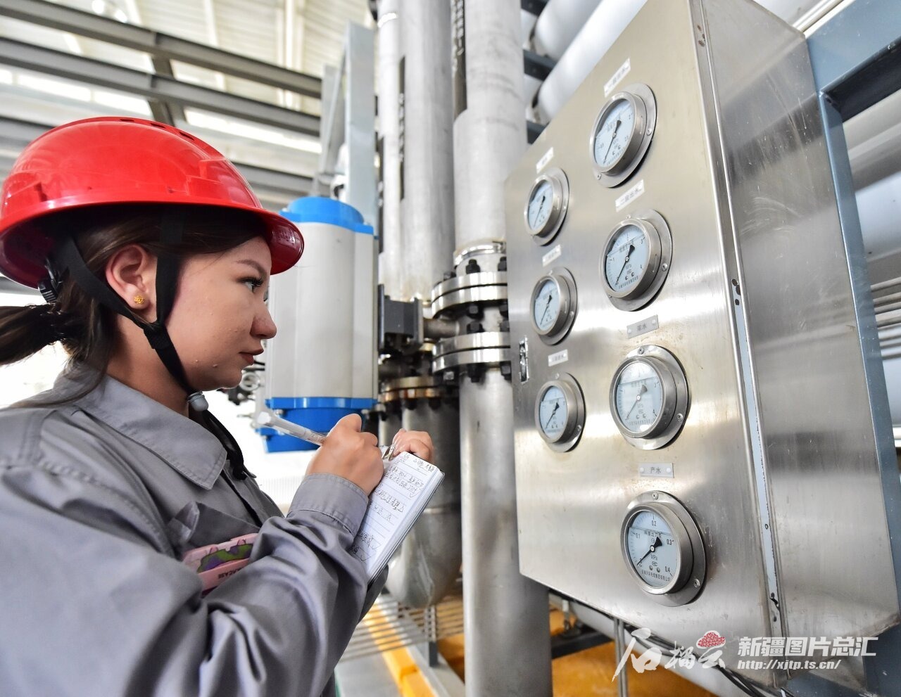 8月21日,新疆上和恒瑞环境有限公司石化园污水处理厂工作人员在污水处理车间抄录生产数据。
