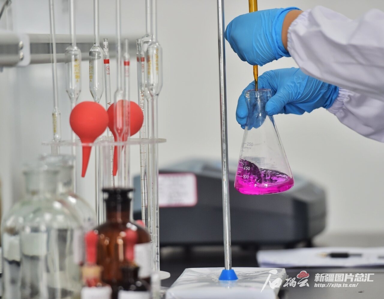 8月21日,新疆上和恒瑞环境有限公司石化园污水处理厂工作人员在质检中心对处理后的水进行抽样化验。