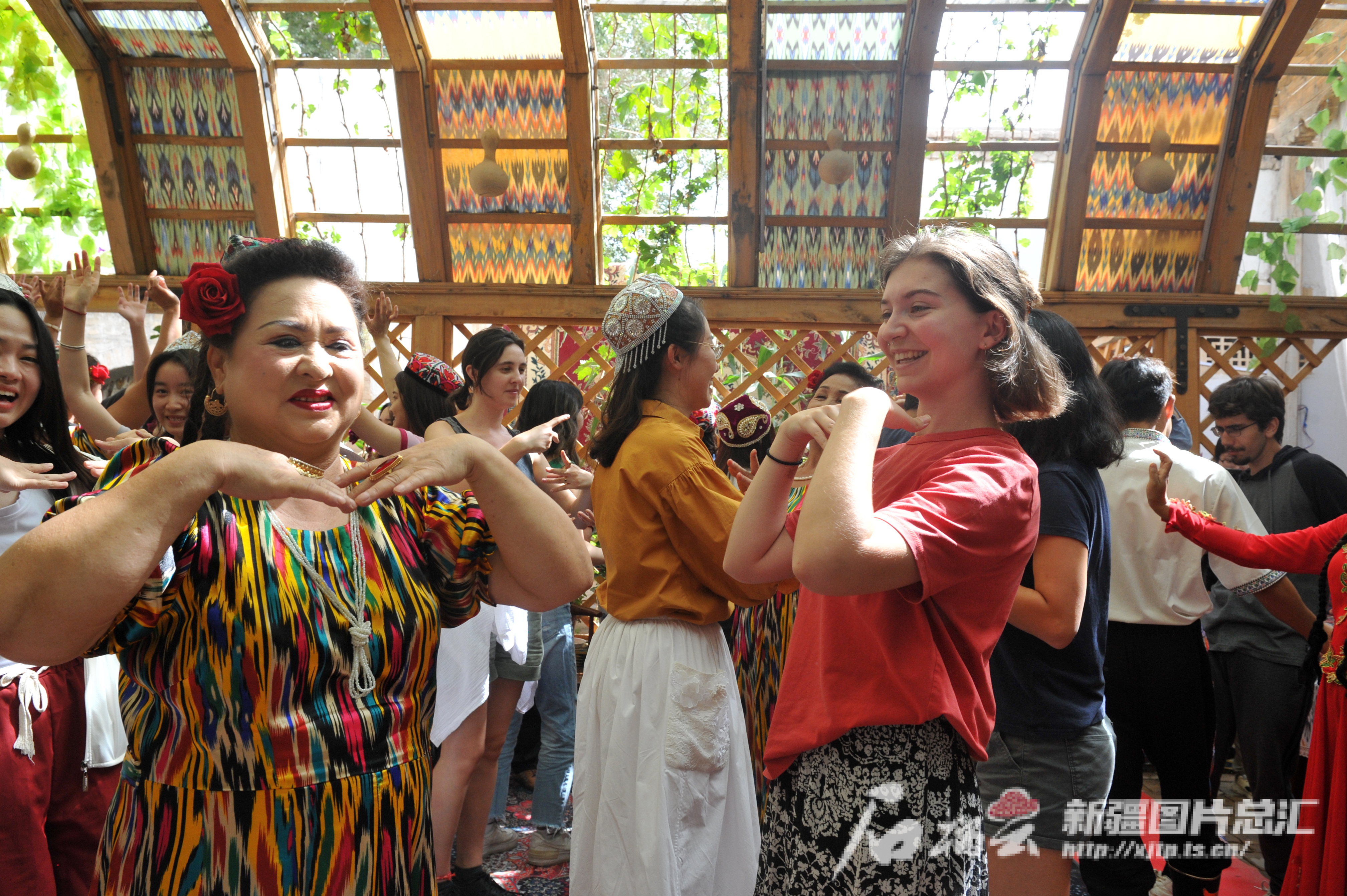 石榴云/新疆日报讯(记者 秦梅花摄影报道)欢快的舞蹈跳起来,甜美的歌儿唱起来,8月22日,在库车市龟兹小巷“爷爷的家”,北京大学美国留学生唐可和当地居民跳起了民族舞蹈。一曲终了,唐可兴奋地说:“我学会扭脖子了”。当日,参加“理解当代中国 感知开放新疆”研学之旅的54名北京大学留学生及港澳台学生走进阿克苏地区库车市龟兹小巷,参访古民居、欣赏民族歌舞、品尝特色小吃,近距离感受老城居民的幸福生活。