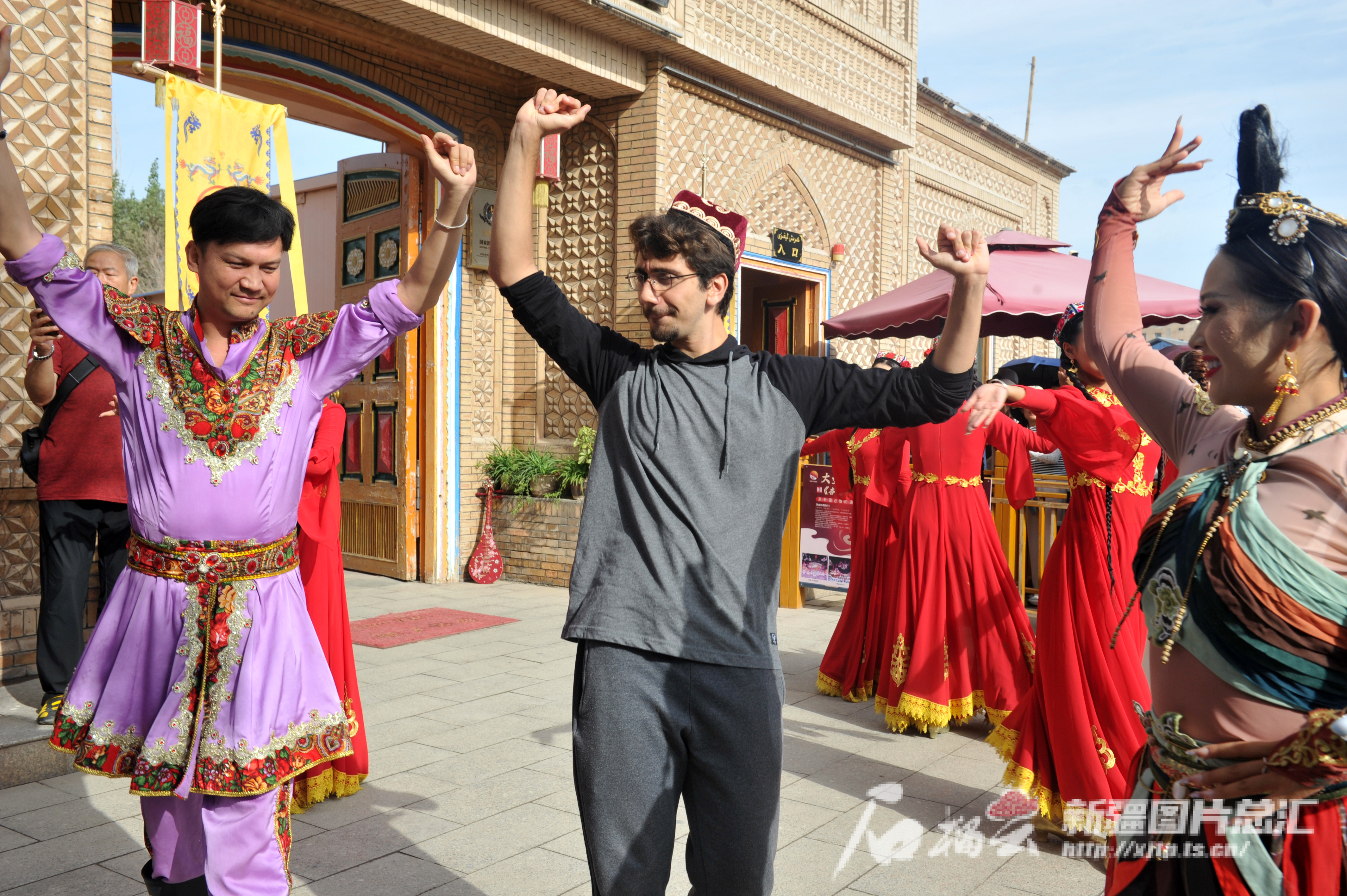 8月22日,北京大学留学生丹尼尔在库车王府和当地演员共舞。