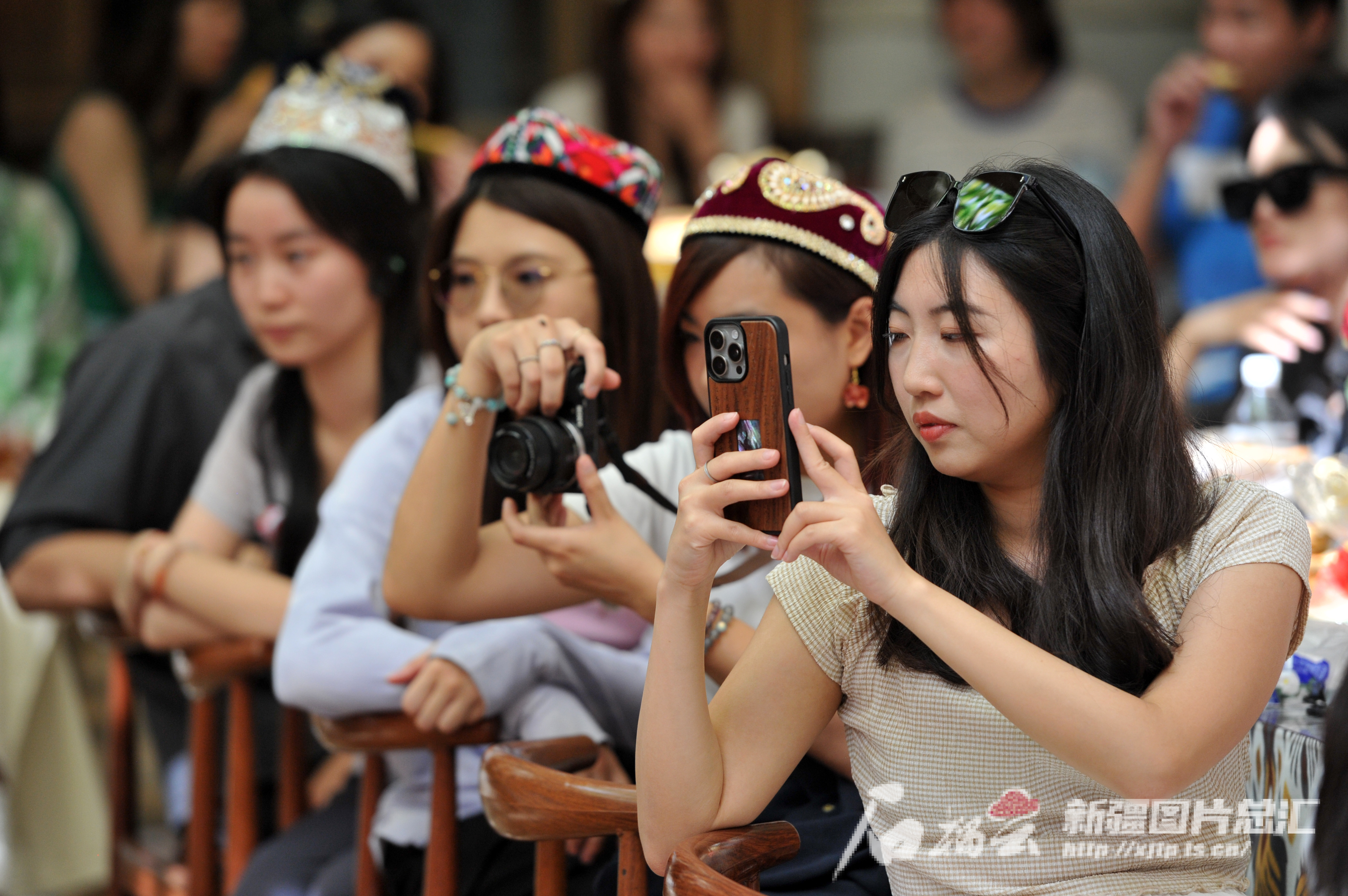 8月22日,北京大学留学生及港澳台学生在库车市龟兹小巷拍摄当地居民表演民族舞蹈。