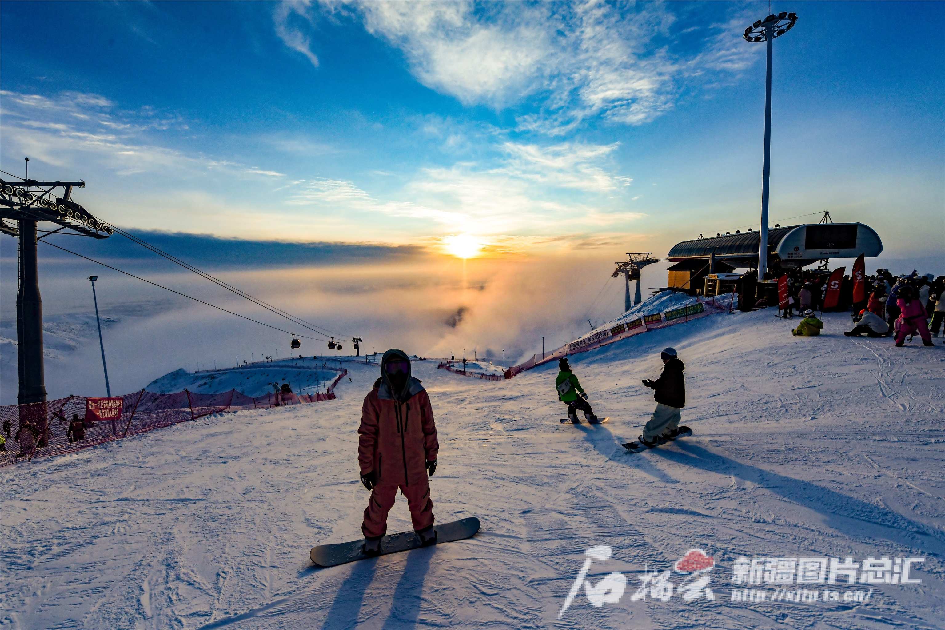 2024年1月18日,游客在阿勒泰市将军山国际滑雪度假区看夕阳,感受“人类滑雪起源地”的冬日风情。石榴云/新疆日报记者 周鹏摄