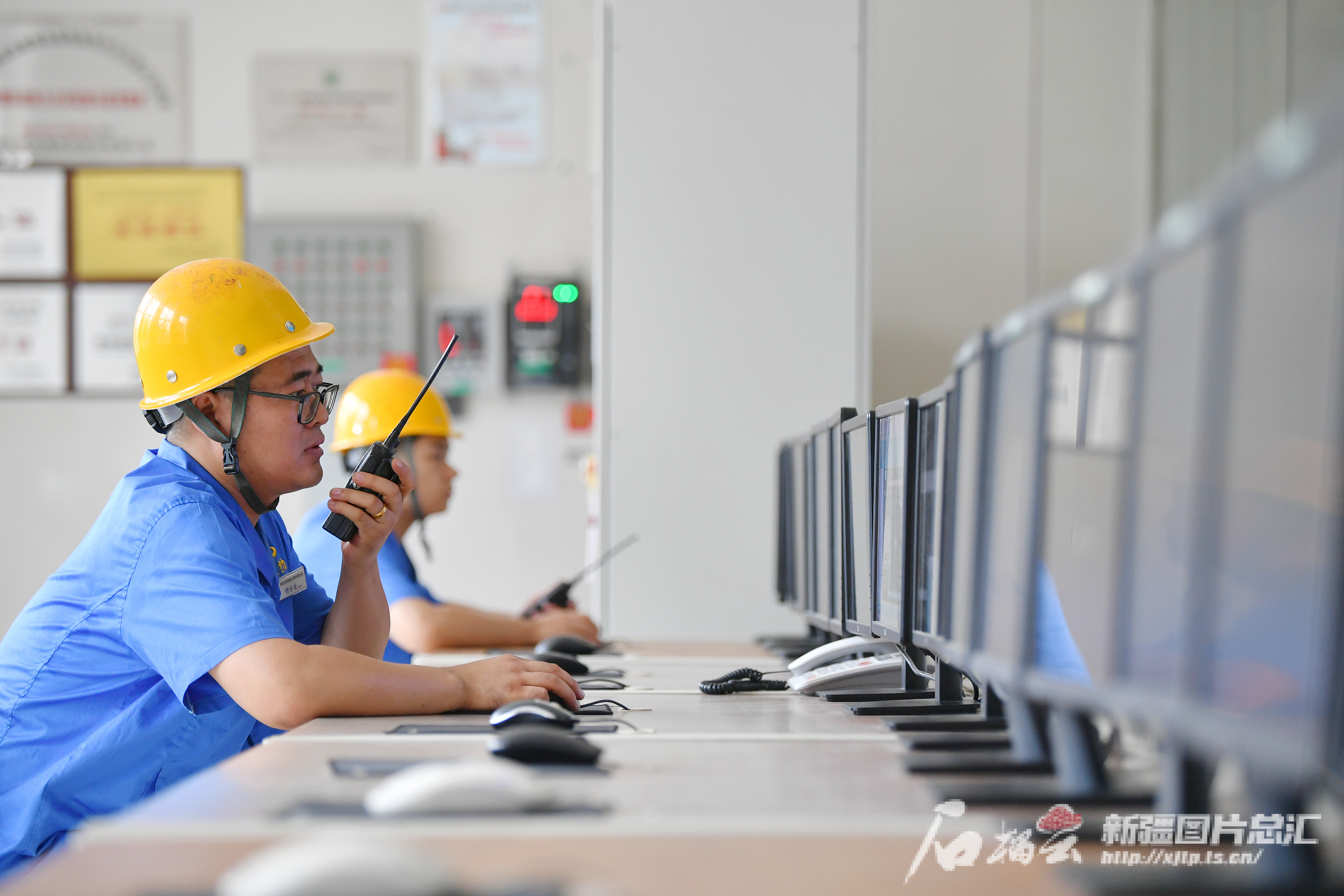 8月29日,工作人员在乌鲁木齐华源热力股份有限公司城北调峰热源厂中控室下达指令。