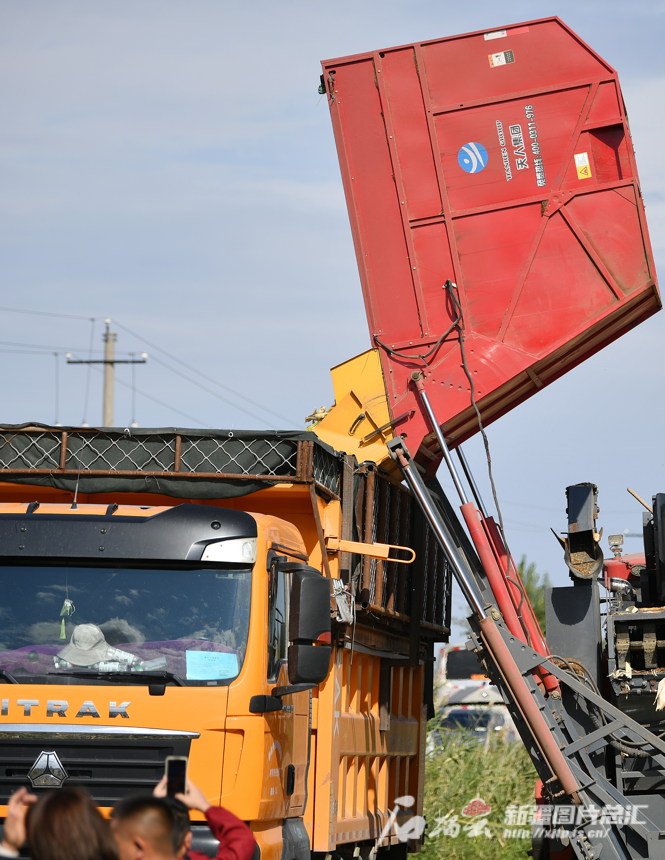 9月26日,工作人员驾驶玉米收割机在察布查尔锡伯自治县爱新舍里镇安巴帖村的玉米地里,将制种玉米倒入卡车。