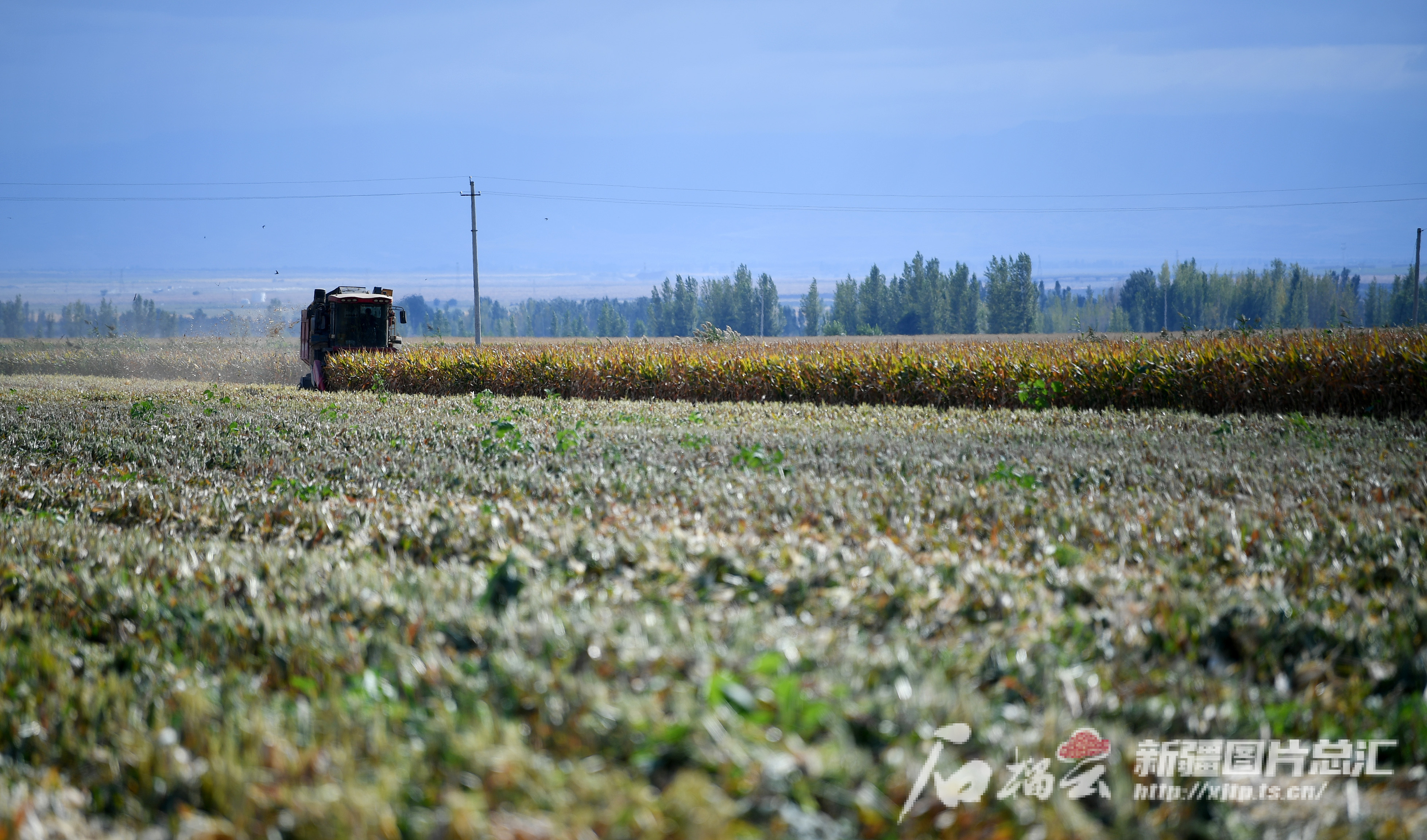9月26日,工作人员驾驶玉米收割机在察布查尔锡伯自治县爱新舍里镇安巴帖村的玉米地里收割制种玉米。
