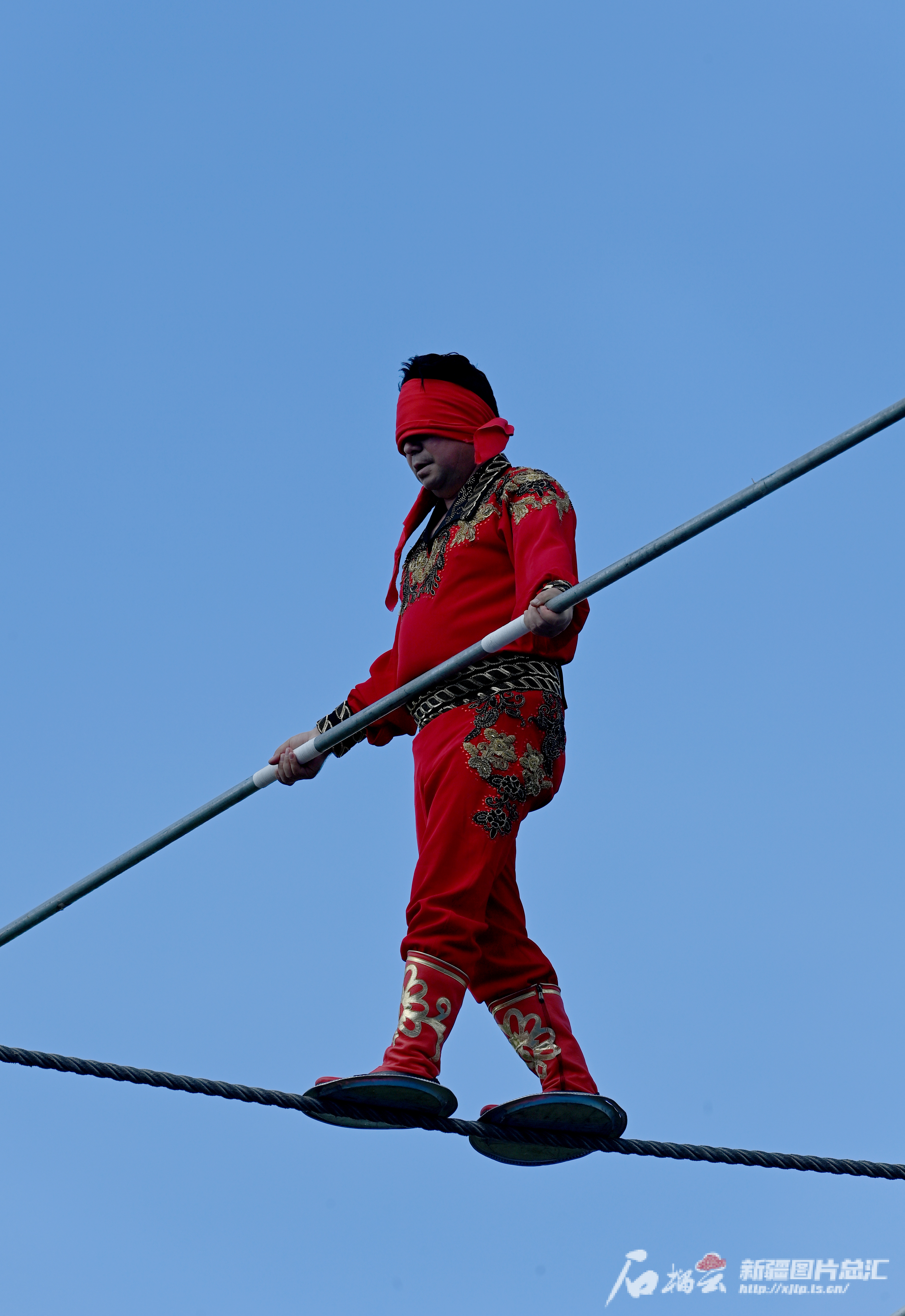 天山网-新疆日报讯(记者韩亮摄影报道)11月24日,“高空王子”阿迪力·吾休尔在展示达瓦孜技艺。 当日,在第十二届全国少数民族传统体育运动会表演项目比赛中,新疆代表团达瓦孜队队长、“高空王子”阿迪力·吾休尔和队员们手握平衡杆,在高21米、长80米的钢丝绳上如履平地,跑索、翻转、蒙面走、空中飞人、高跟鞋走索……惊险刺激的表演让观众惊叹不已,现场叫好声此起彼伏。最终,新疆达瓦孜队在表演项目第一阶段的比赛中取得9.16分的高分。