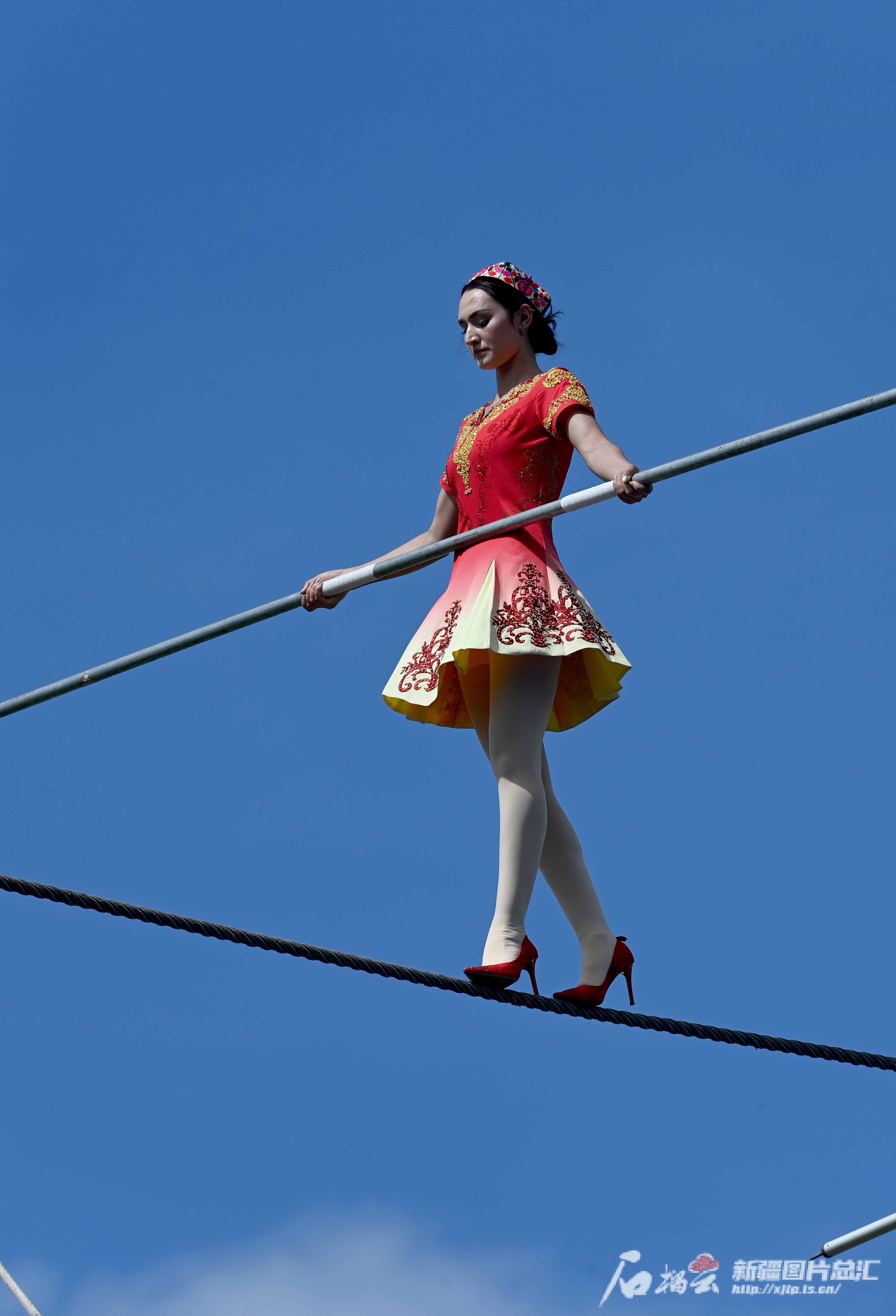 11月24日,新疆达瓦孜队队员在展示高跟鞋走钢丝特技。