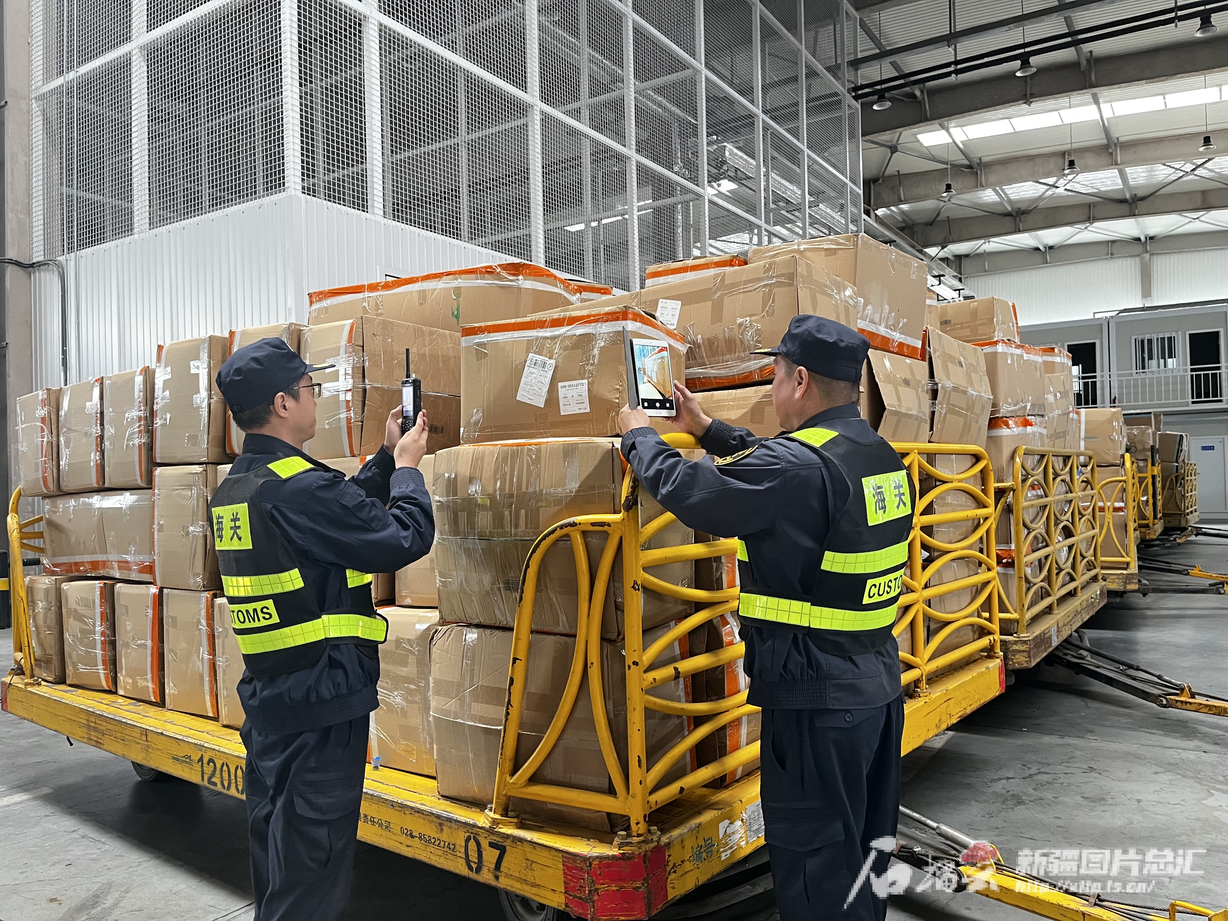10月25日,乌鲁木齐地窝堡机场海关关员查验出口货物。刘奕鸽 摄