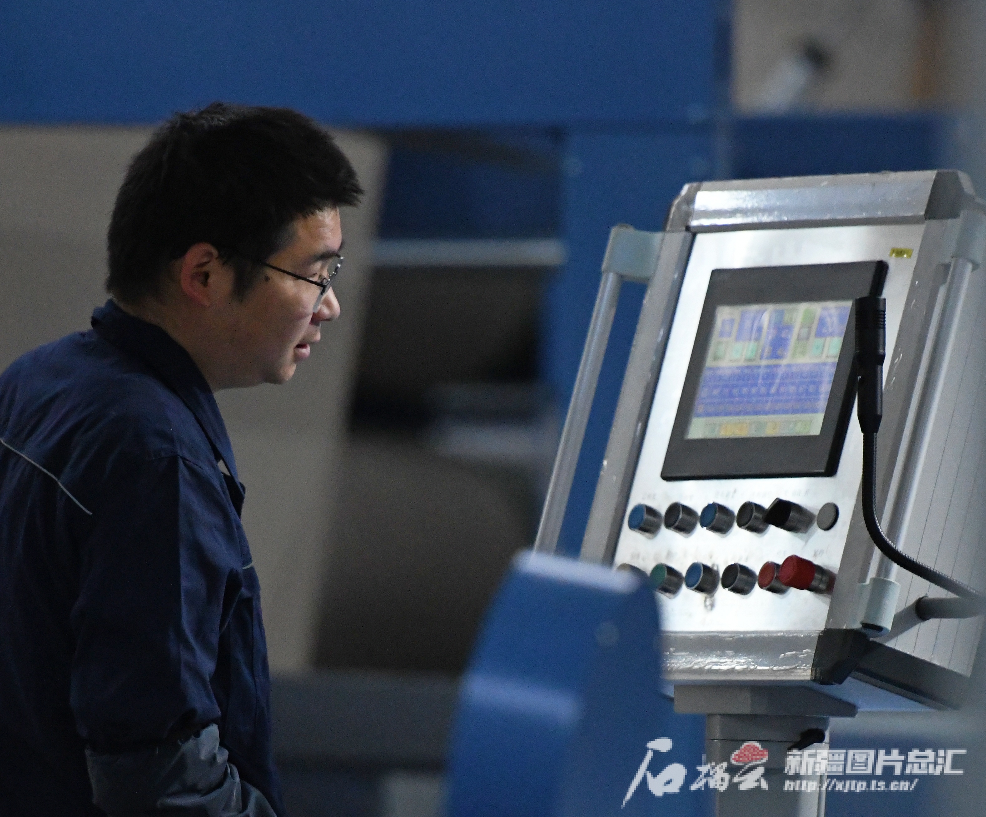 2月18日,新疆德利家纺印染科技有限公司员工在查看设备运转状况。