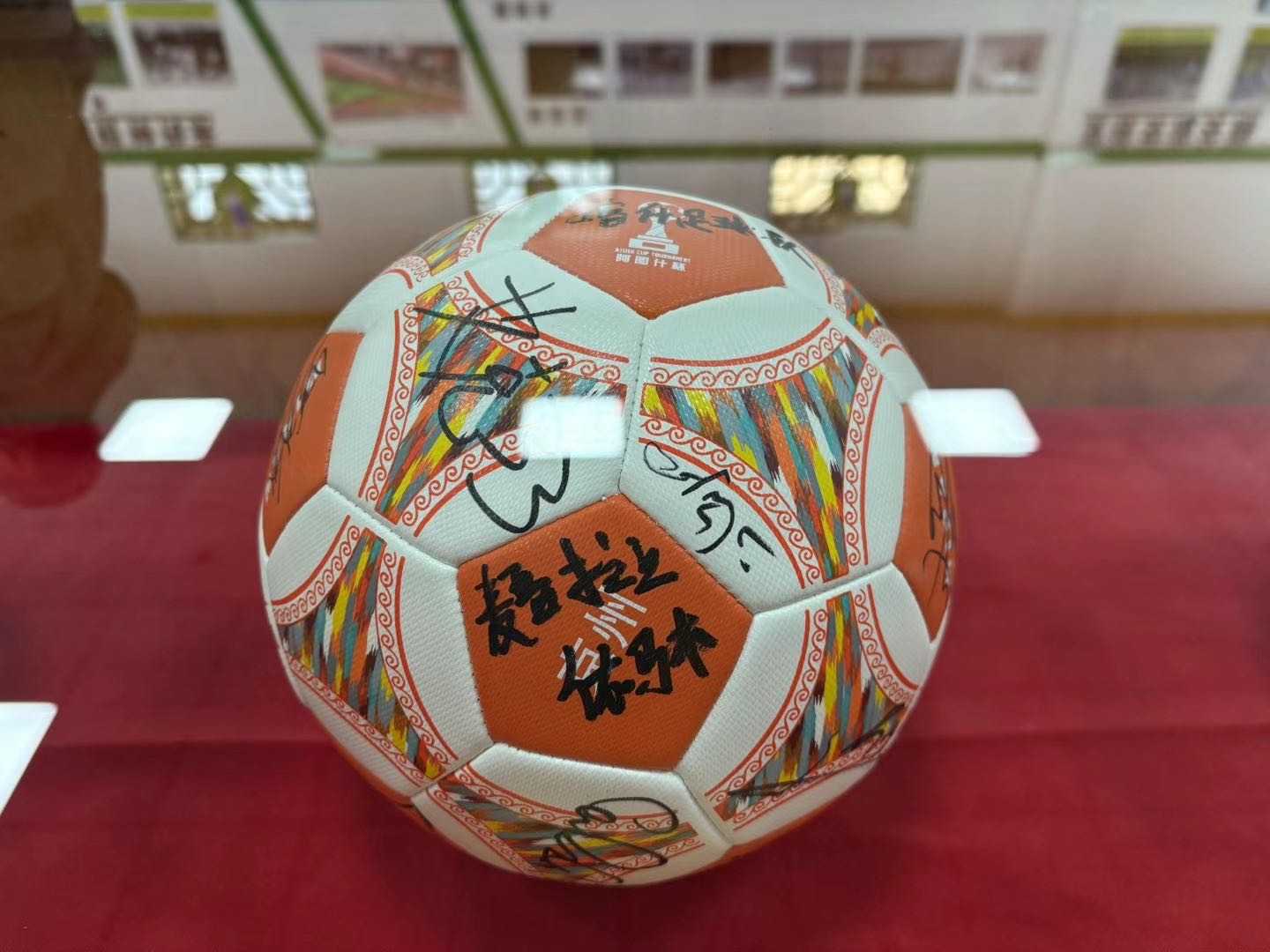 如扎吉·雪合热提所在公司定制的艾德莱斯花纹的足球。天山网-新疆日报记者王晶晶摄