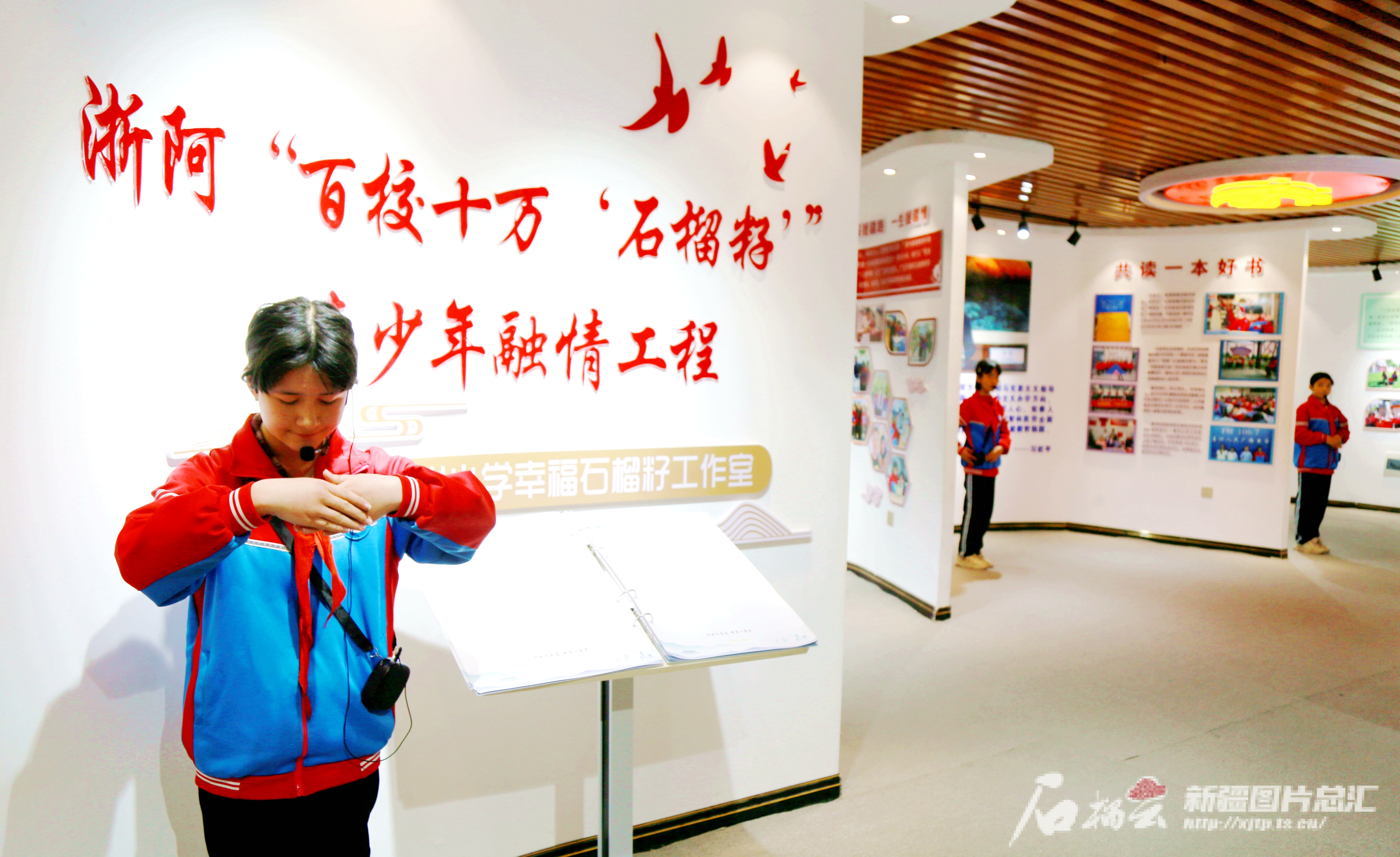 4月11日,乌什·衢州小学小小讲解员在“石榴籽”青少年融情展馆,向访客施礼,并讲述衢乌两地青少年交往交流交融的故事。天山网-新疆日报记者 王琦铭摄