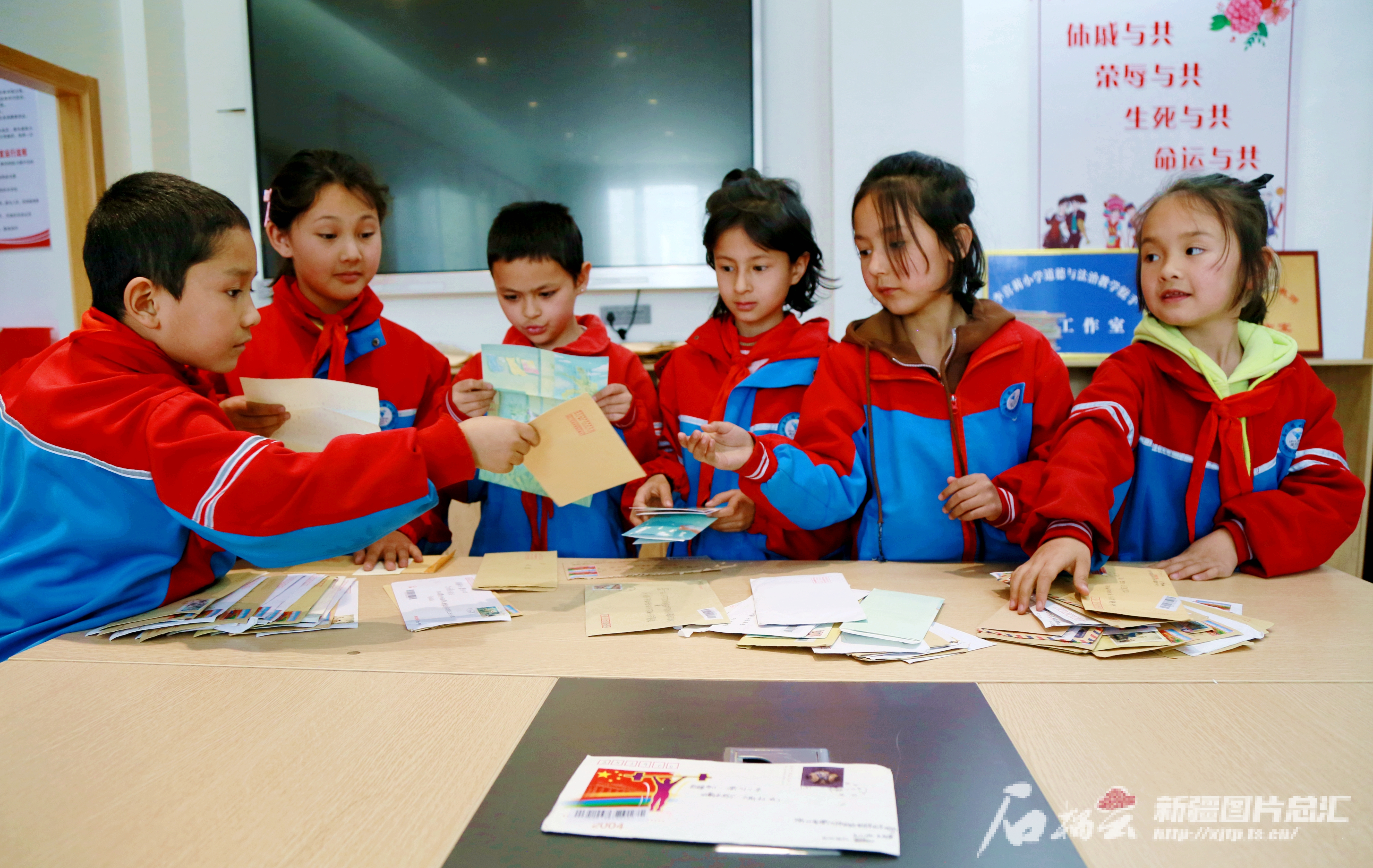 4月11日,乌什·衢州小学学生翻看衢州小伙伴来信。谢令 摄