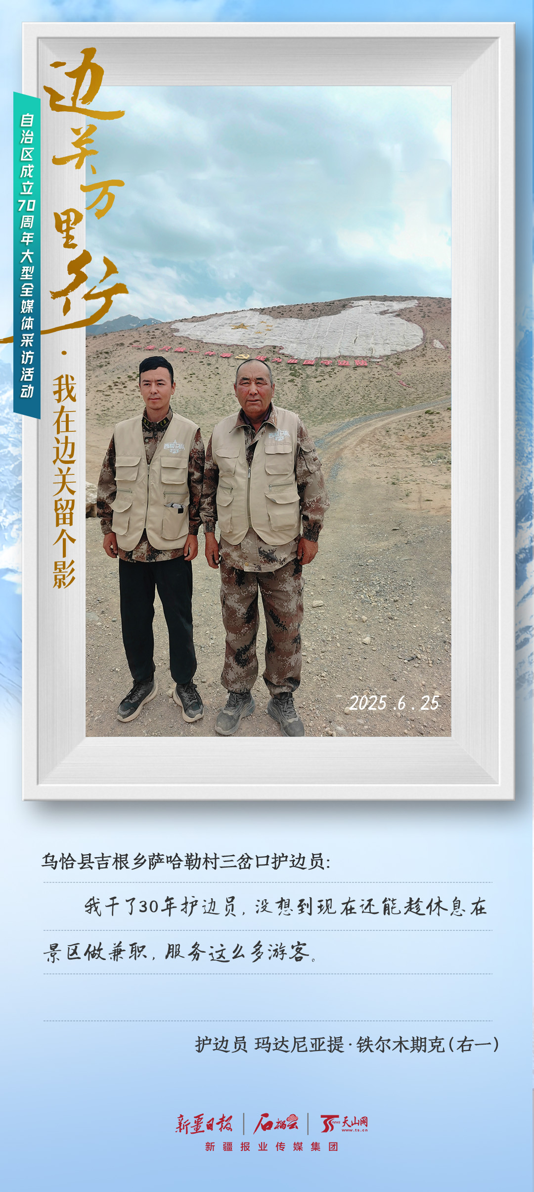 6月25日,“边关万里行——自治区成立70周年大型全媒体采访活动”南线采访团队来到克孜勒苏柯尔克孜自治州乌恰县吉根乡,发现这里的护边员在巡边任务之外的时间里,还在西极景区的马队做兼职。随着这两年来西极景区的开发建设,现年57岁的玛达尼亚提·铁尔木期克从一名护边员“跨界”成一名马队向导,每月在完成巡边工作后,他总会与村里的亲戚朋友一起在景区做兼职,不仅增加了收入,也结识了来自各地的朋友。