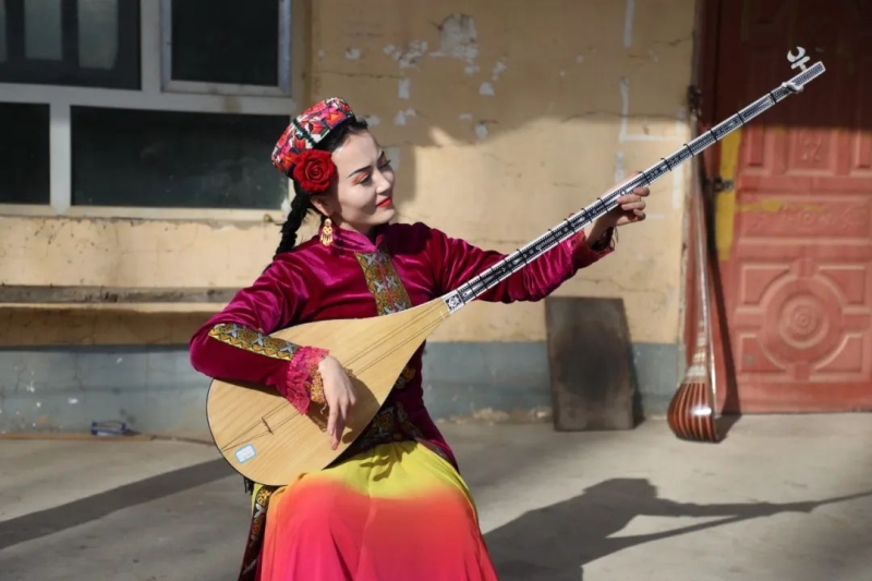 维吾尔族妇女在弹奏都塔尔。库车市融媒体中心供图