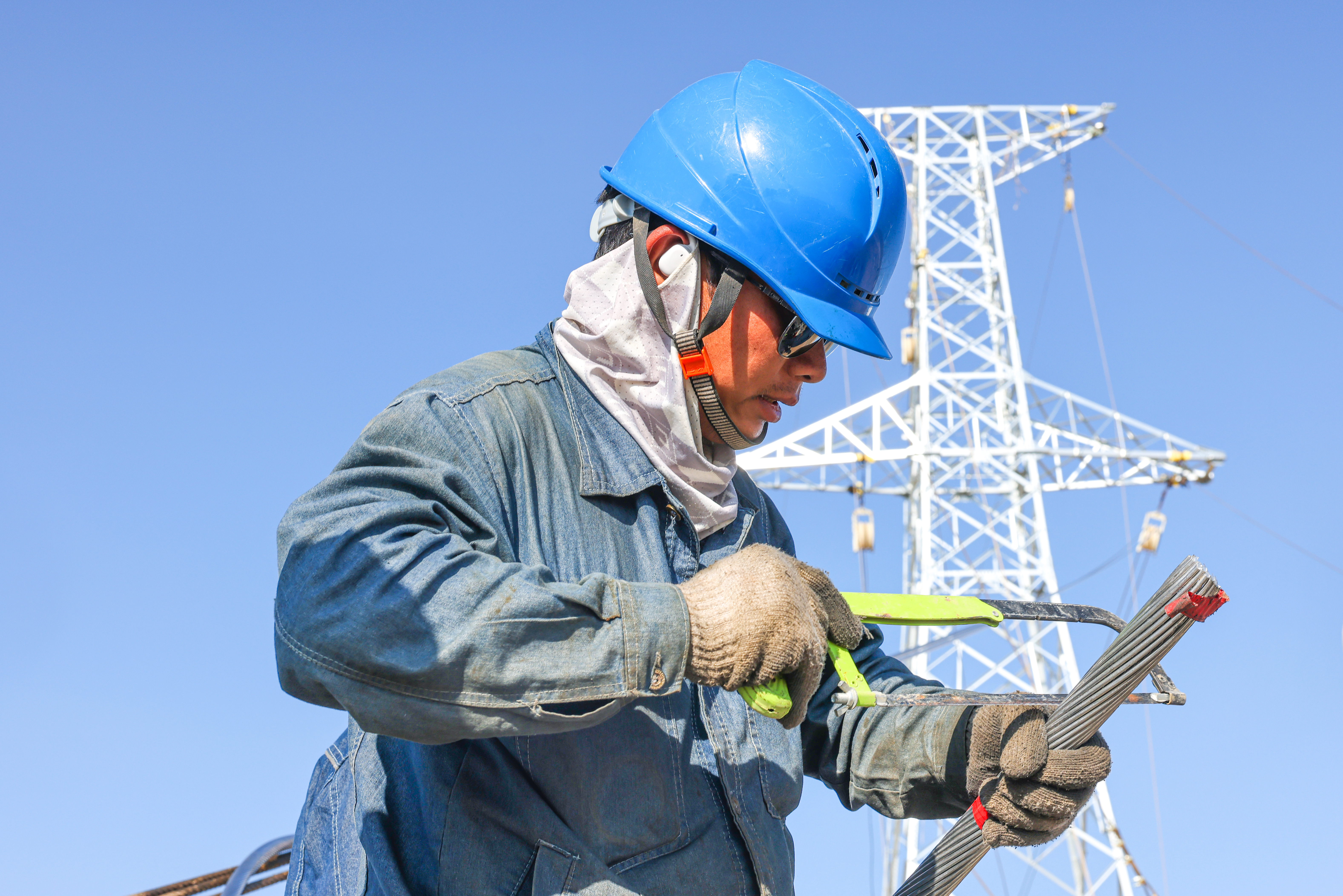 8月15日,在新疆维吾尔自治区昌吉回族自治州木垒哈萨克自治县川月升压汇集站220千伏送出工程现场,施工人员正在进行导线接续工作。